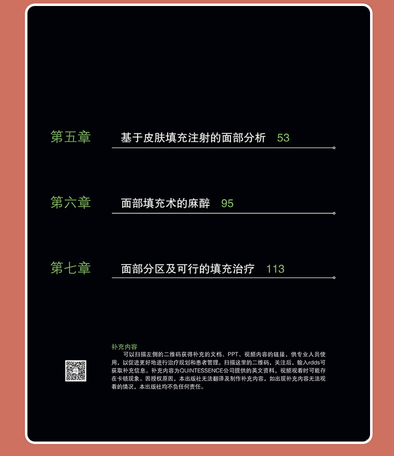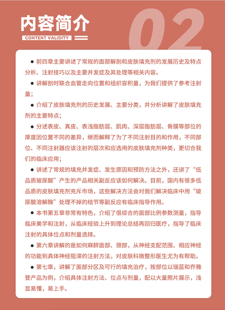 本書專注於皮膚填充劑對面部的填充,從面部美學分析、照片拍攝技巧、肌肉解剖、注射要點分析、玻尿酸與肉毒毒素聯合應用,到術前術後效果對比,由淺入深,事無巨細地解釋得清晰詳盡,可以說是和高階微整形醫生的價值觀高度契合的。