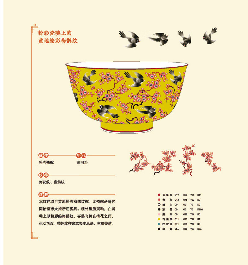 180粉彩瓷碗圖樣上的黃地梅鵲紋
