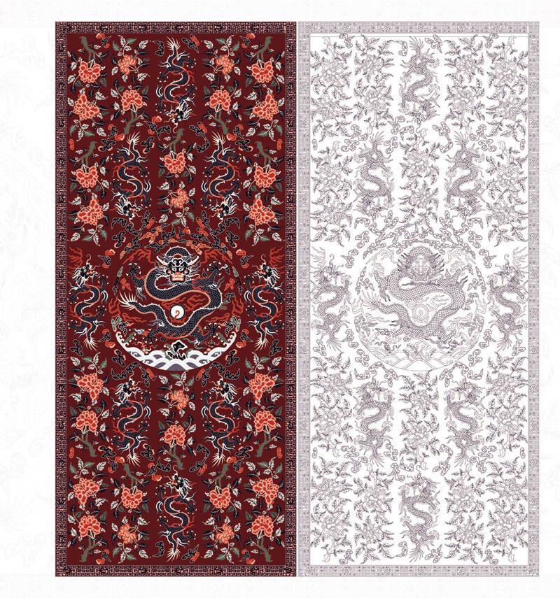 090漳絨炕毯上的醬地織彩九龍牡丹紋