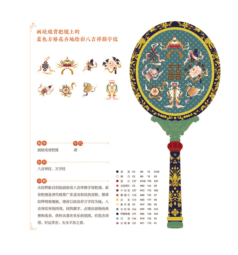 本書收錄了150組中國喜紋樣,紋樣類型眾多,包括龍鳳呈祥、喜結連理、多子多福、如意吉祥四部分內容。 涵蓋龍、鳳、獅、魚、蝶、鳥等神禽瑞獸、大自然的動物,牡丹、蓮花、梅、蘭、竹、葫蘆、瓜果等花卉植物,還有如意、八寶、暗八仙、喜字、萬字、團壽字等諸多祥瑞紋樣。 涉及瓷器、景泰藍、漆器、織物等多種工藝載體。 本書每一種紋樣都提煉出載體、年代、紋樣和寓意,並配上由紋藏團隊繪製的紋樣向量圖、線圖、單獨紋樣和色板,便於讀者更清晰地理解和使用。