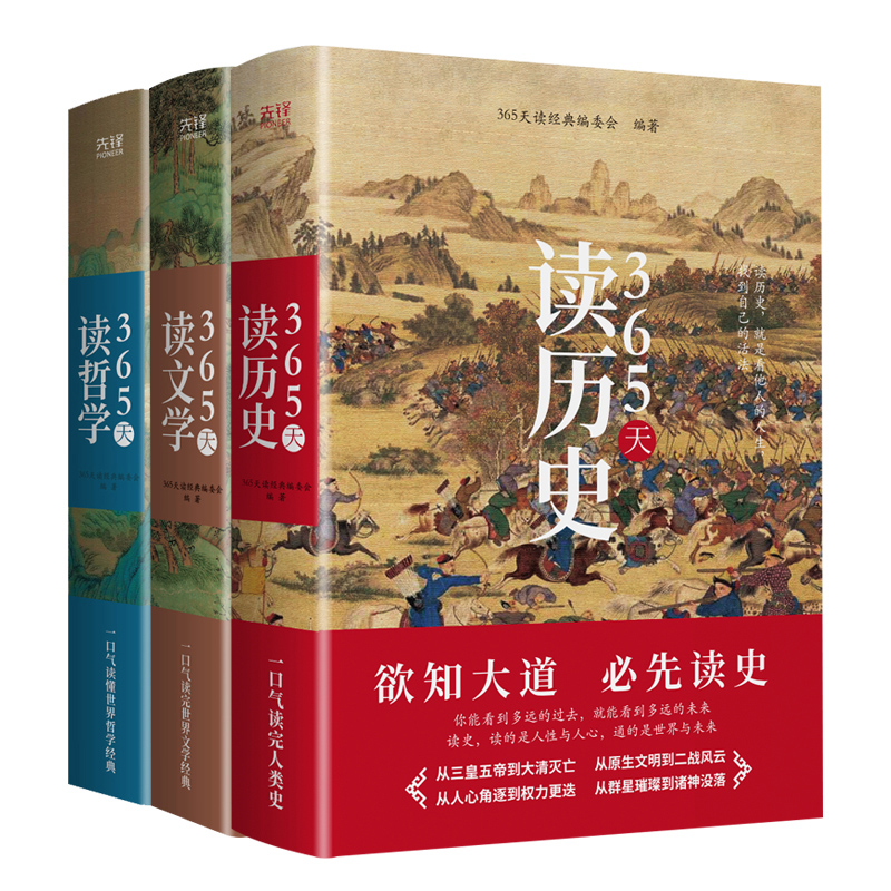 2.《365天讀歷史》包含中國史和世界史兩部分,讓你一本書通曉五千年中國史 世界文明史;《365天讀文學》收錄作品皆是中外文學經典、名家名作,分爲詩詞佳作、散文精粹、小說名作、戲劇經典四大部分,更有翔實註釋 解題,實現無障礙閱讀;《365天讀哲學》幾乎涵括中外所有經典哲學理論,將那些深奧的哲學思想通俗化、直白化,即使零哲學基礎也能看得懂。