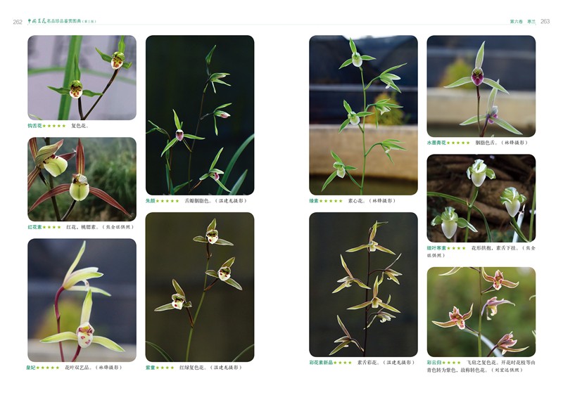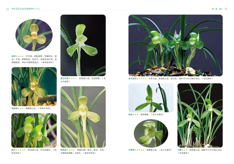 亮點二新:此次修訂注重收錄近年湧現的新品種,如春蘭長樂荷、大中華、雪裏桃花等,蓮瓣蘭虞美人、東方紅、珍荷等,春劍富貴紅、凝脂、媚荷等,蕙蘭空谷足音、鳳羽、陽城素等,建蘭聖雪、玉白丹紅、天龍紫荷等,寒蘭金玉滿堂、皇妃、緣素等。 本次修訂收錄新品及傳統經典傳統名品400餘種。
