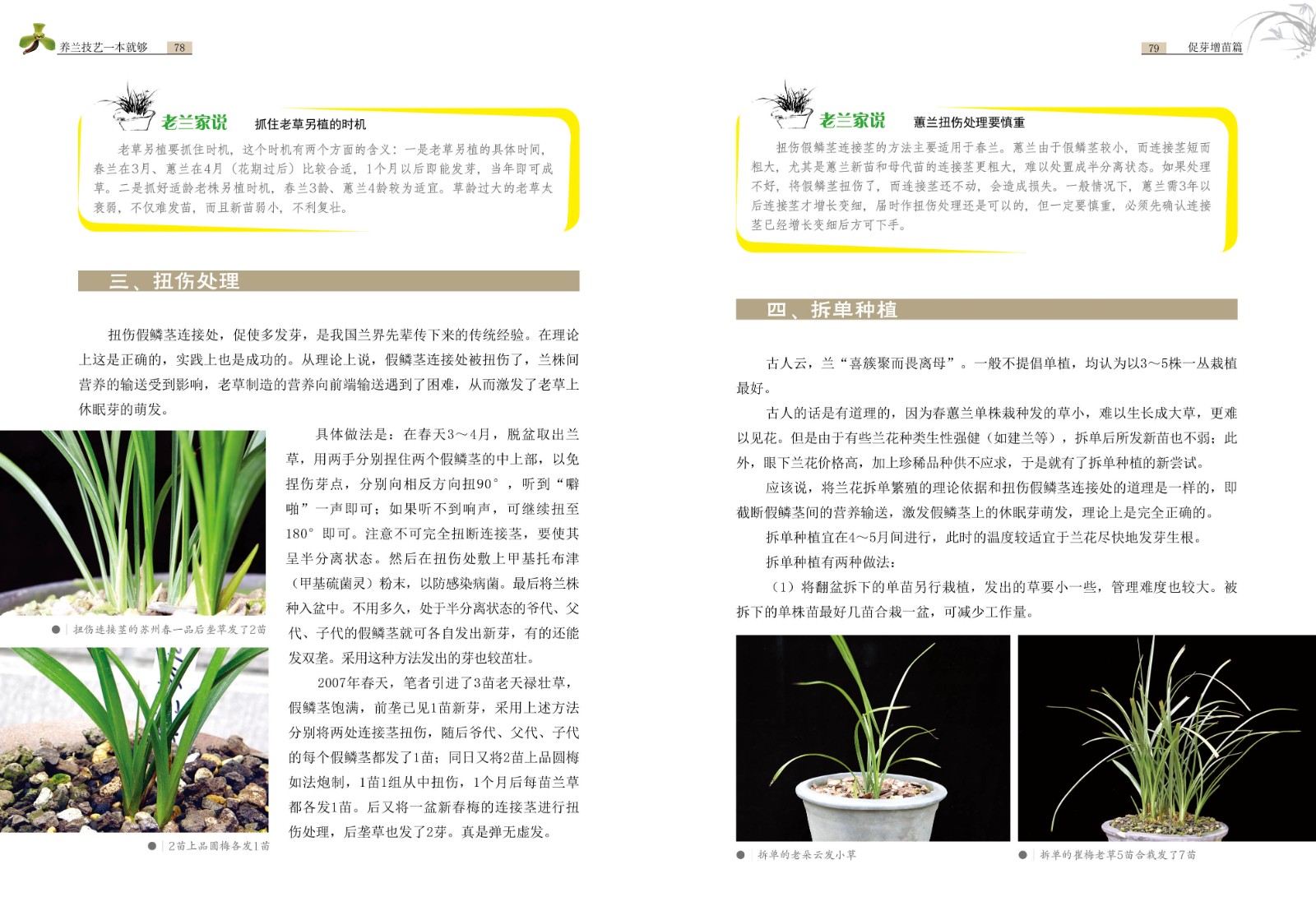 亮點二實用性強:重點介紹養蘭中的關鍵技藝,如弱苗小苗的復壯技藝、促二次發芽技藝、光蘆頭催芽技藝、催花技藝、促花好香足技藝、杜絕空根技藝、防止葉片焦尖技藝等。