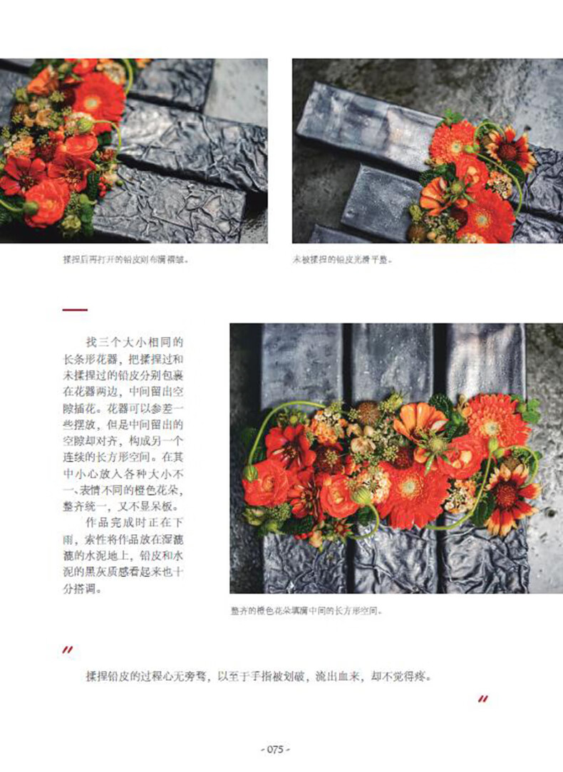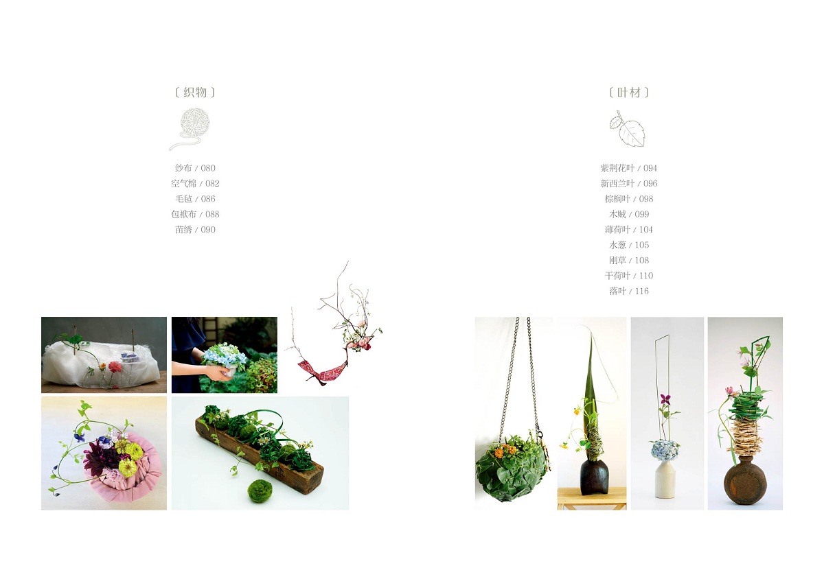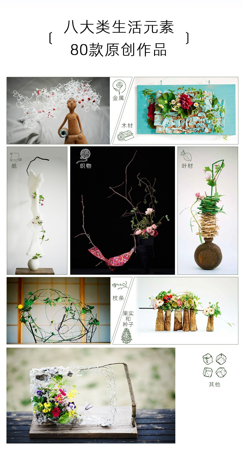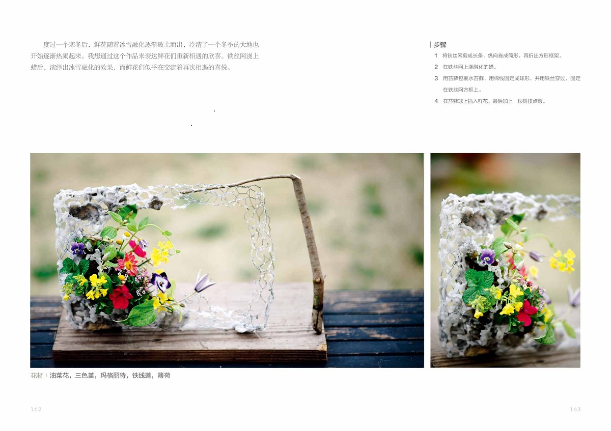 《心境花藝:有溫度的創意插花》收錄了100餘件創意插花作品,分為日常生活插花、花器運用、材質特點呈現、形式突破、構成手法和情感表達七個篇章。