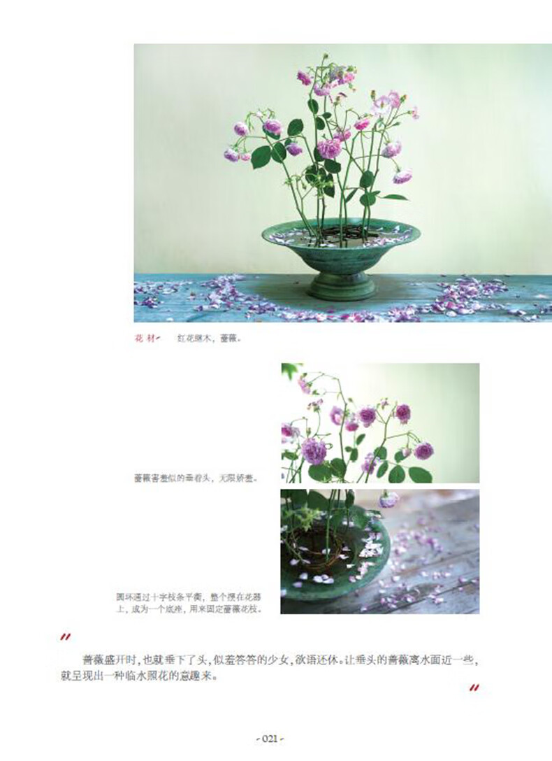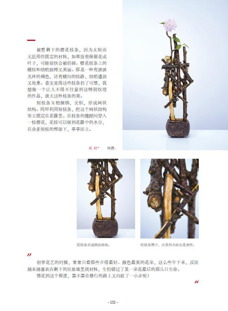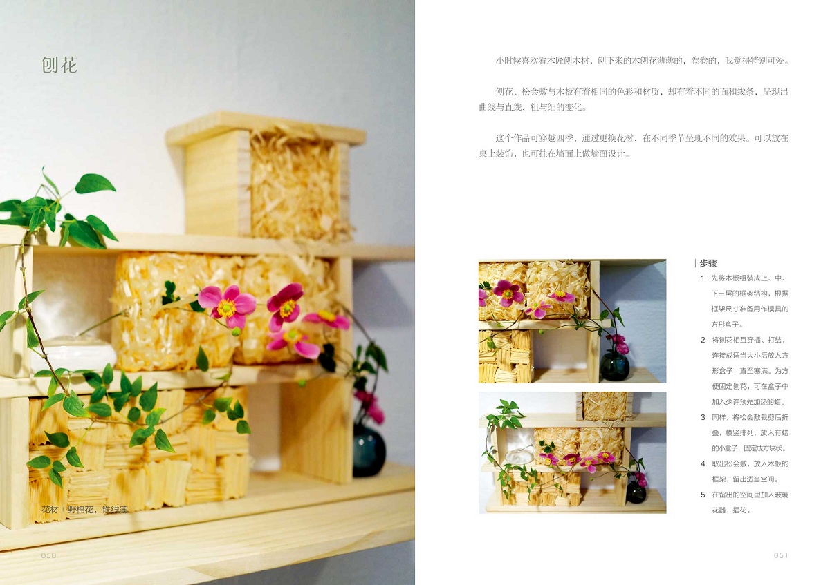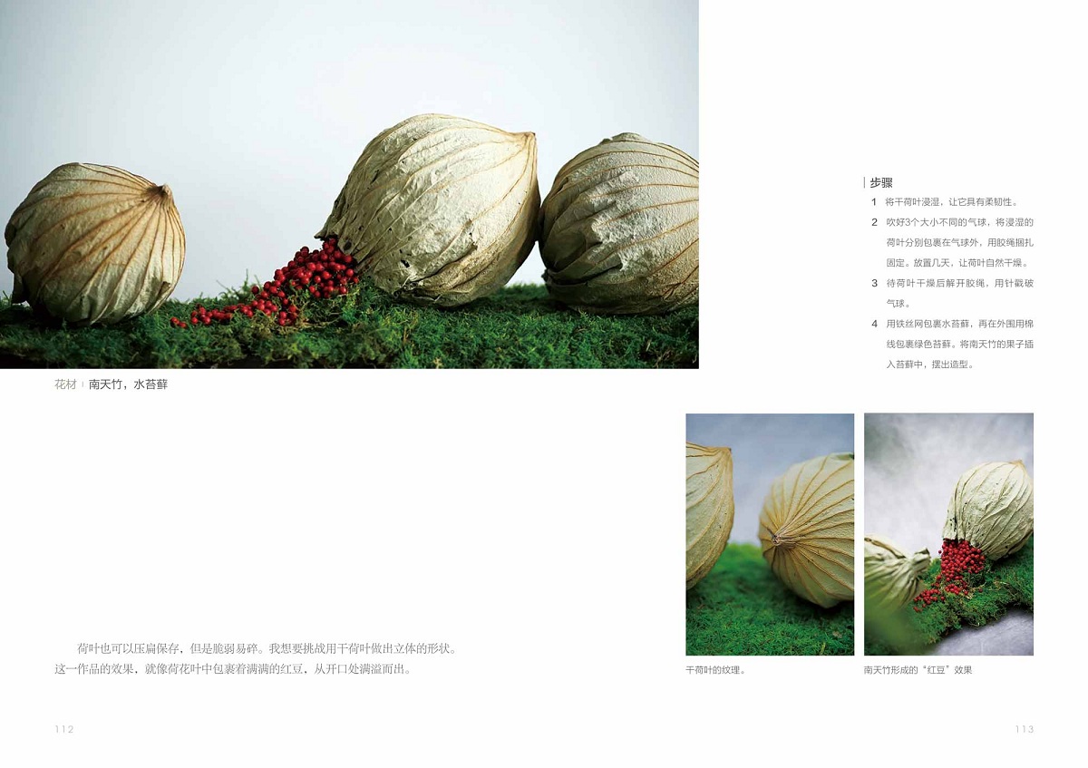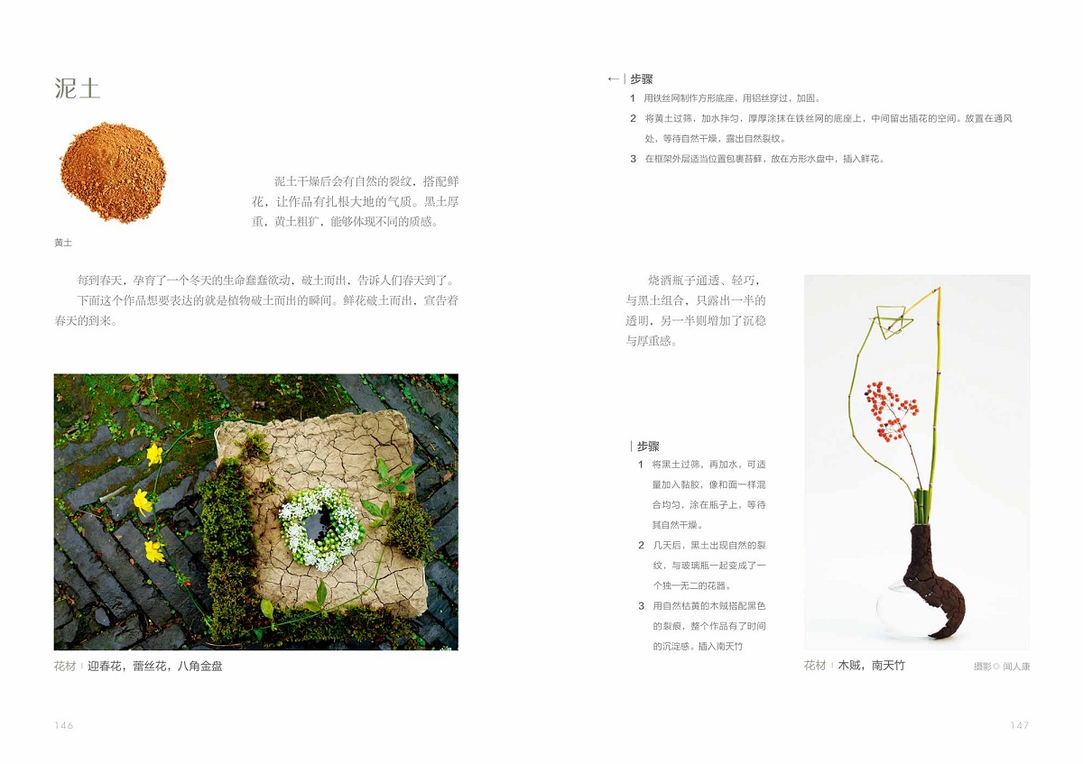 《心境花藝:有溫度的創意插花》收錄了100餘件創意插花作品,分為日常生活插花、花器運用、材質特點呈現、形式突破、構成手法和情感表達七個篇章。