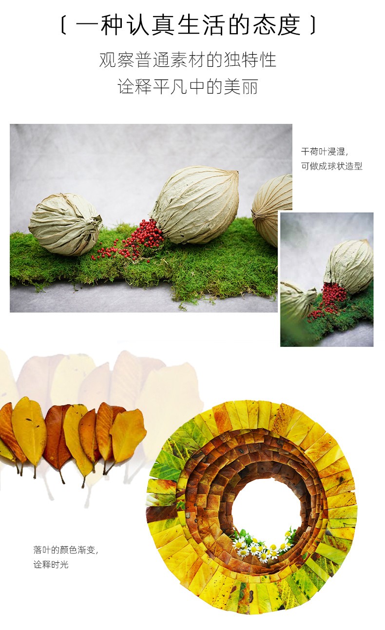 春天的油菜花,夏天的綠葉,秋天的果實和落葉,都是插花可以利用的素材,加上一點對美的好奇,對植物的耐心,讓美好綻放在生活中。