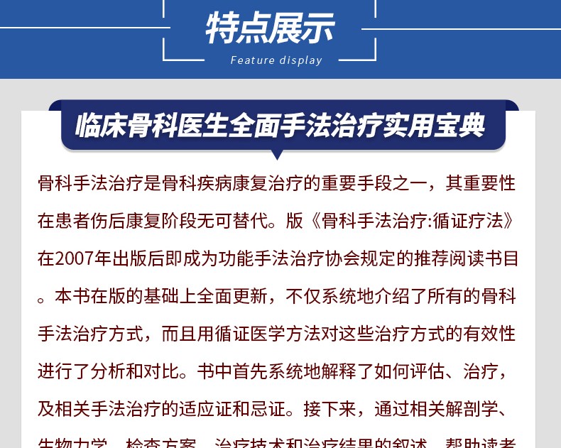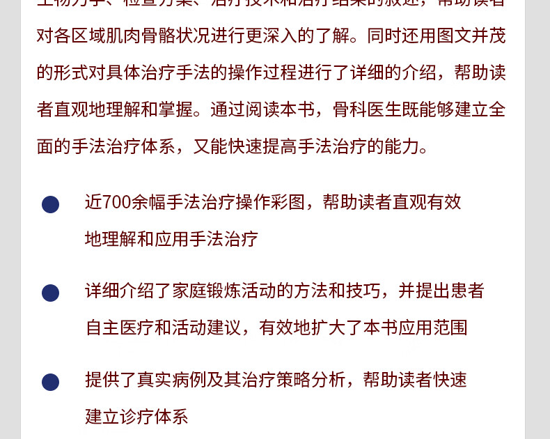 ★書中提供了700餘幅手法治療操作的彩圖,幫助讀者直觀有效地理解和應用手法治療。