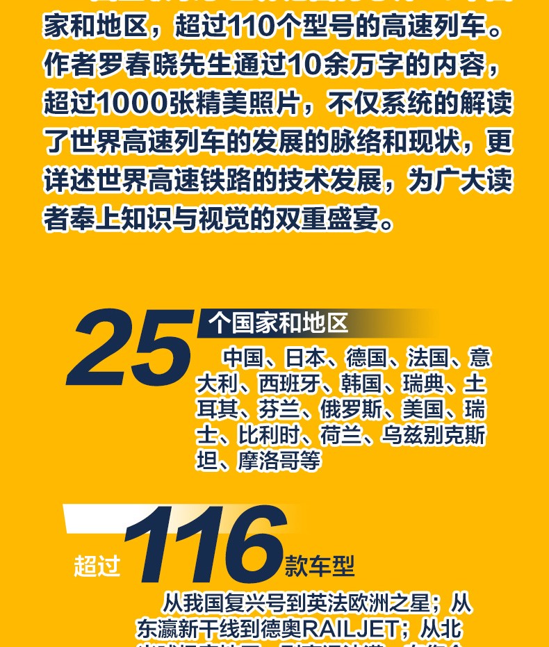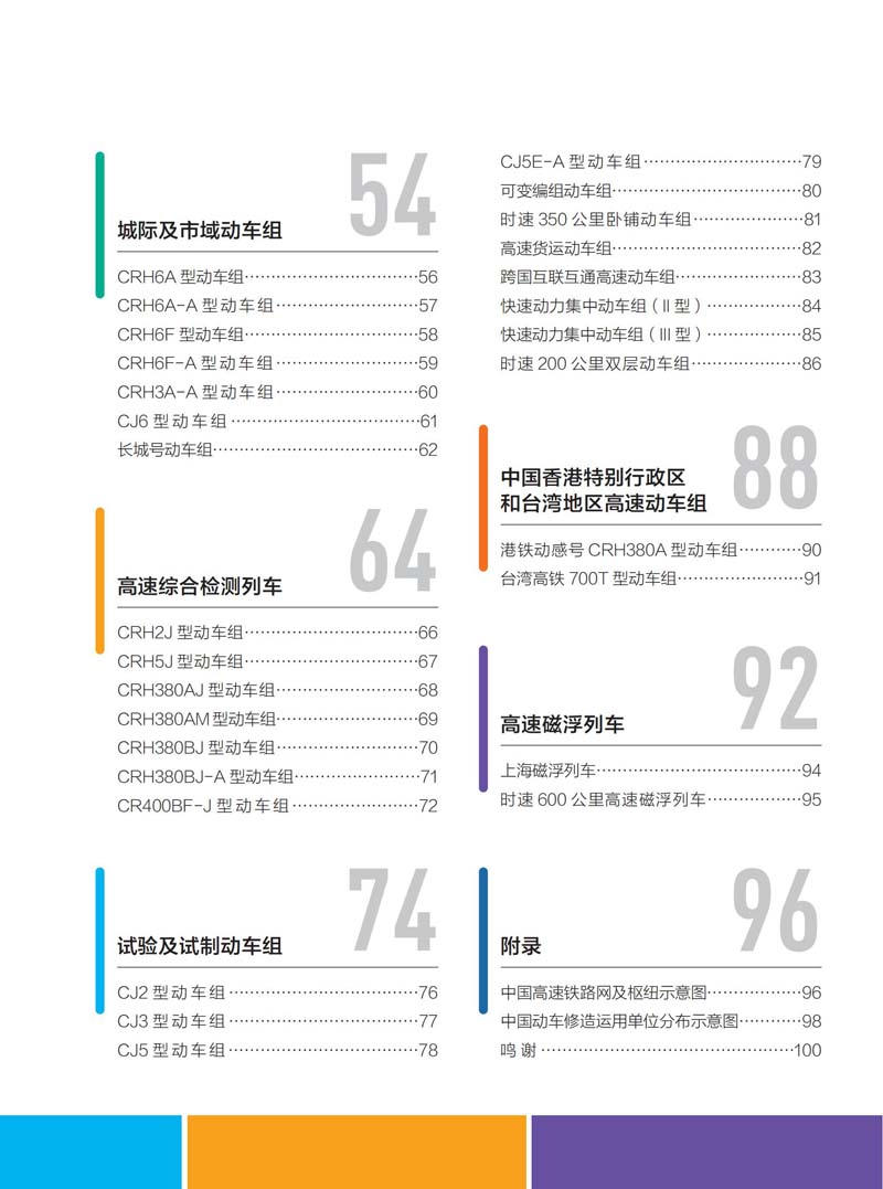 本書作為一本科普圖鑒,以2019年12月底為限,以定型並批量投入運用、*設計速度200km/h及以上為原則,收錄了除沙烏地阿拉伯外全球所有擁有高速列車的國家和地區,共計124款高速動車組列車,全面梳理了世界高速列車科技資訊與發展脈絡。