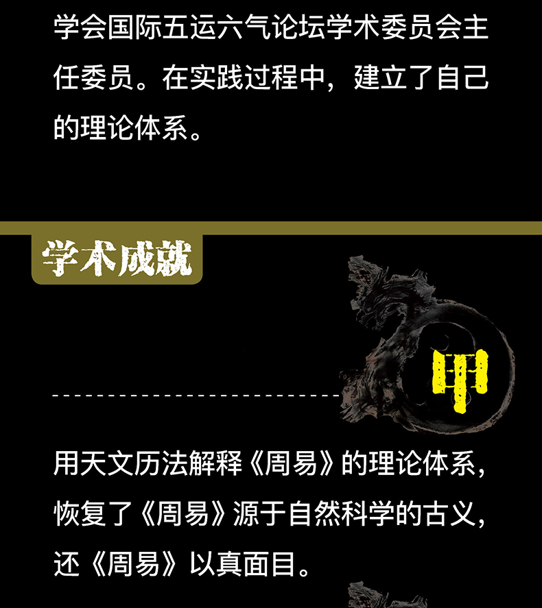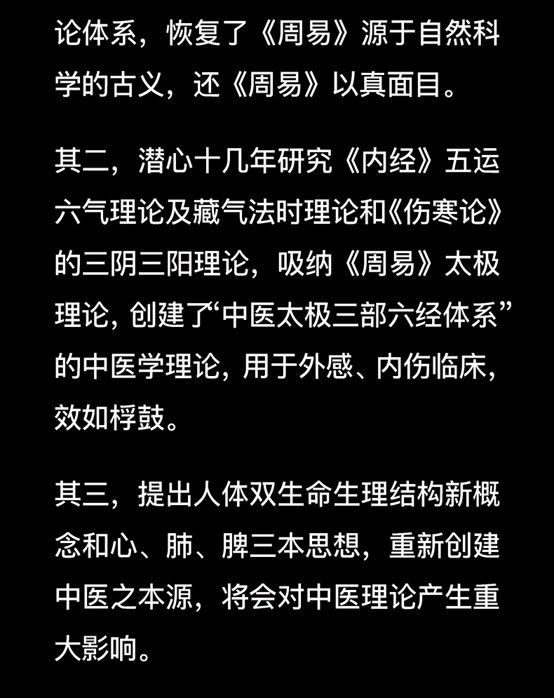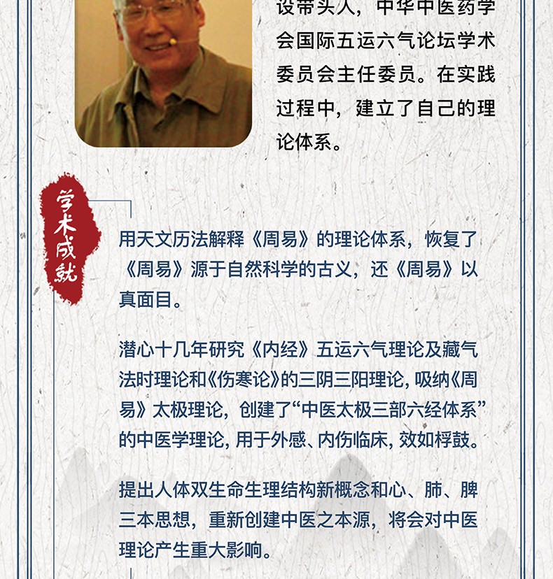 男,河南滑縣人,執業中醫師,“中醫太極三部六經體系”創始人,北京中醫藥大學特聘學科建設帶頭人,北京中醫藥大學大學生創業導師,中華中醫藥學會國際五運六氣論壇學術委員會主任委員。學術成就幾十年來從事中醫和周易的研究,並涉及到子史經傳等。其中的成就是建立了自己的理論體系。其一,《周易》是中華傳統文化的源頭,位居十三經之首,歷代《周易》註解家多從人文社科方面闡釋。衆所周知,伏羲是仰觀天文、俯查地理及旁觀萬物而畫八卦,這說明《周易》之卦來源於自然科學,決不是起源於ZB。因此我用天文曆法解釋《周易》的理論體系,恢復了《周易》源於自然科學的古義。創作《周易真原》,還《周易》以真面目。論文《論太極圖是原始天文圖》一文,被周易與現代化國際學術討論會評爲現代易學優秀論文,榮獲“紅旗渠杯”獎。由於對易學研究的突出貢獻,2003年榮獲了“易都杯”易學研究優秀成果獎。其二,五運六氣理論是《內經》的核心內容,卻被一些學術權威斥之爲迷信,高等中醫院校教材都不講,實爲中醫之不幸。我潛心十幾年研究《內經》五運六氣理論及藏氣法時理論和《傷寒論》的三陰三陽理論,吸納《周易》太極理論,創建了“中醫太極三部六經體系”的中醫學理論,用於外感、內傷臨床,效如桴鼓。找到了研究《傷寒論》理論體系的途徑,解開了《傷寒論》的千古謎團。《中醫內傷火病學》是全面論述內傷火病的惟一一部書,曾獲1993年度第九屆北方十省市優秀科技圖書二等獎。《五運六氣臨床應用大觀》一書,2006年榮獲山西省第七屆優秀科普作品二等獎。其三,提出人體雙生命生理結構新概念和心、肺、脾三本思想,重新創建中醫之本源,將會對中醫理論產生重大影響。
