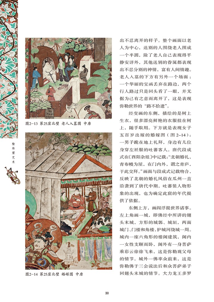 《榆林窟藝術》以深入淺出的語言,分7個章節全面介紹了榆林窟的內容、歷史價值、藝術價值以及*研究成果。* 章節對榆林窟的歷史地理背景、內容及藝術價值進行整體論述。 第二章節至第五章節根據榆林窟各洞窟的時代特徵,分唐代、曹氏歸義軍、回鶻、西夏元代4個時期對榆林窟的石窟藝術進行論述,特別對每個時期典型的代表性洞窟作了圖文並茂的詳細介紹。 第六章節對清朝初年,喇嘛吳根棟在榆林窟東崖洞窟前清理淤沙時發現的象牙佛作了介紹。 第七章節對榆林窟的保護進行闡述。 此外,關於榆林窟石窟藝術的畫冊《榆林窟》同期出版,《榆林窟》以150餘幅精美圖片,配以文字說明,按照時間順序,對榆林窟重要、典型洞窟的壁畫、塑像以及影像藝術進行展示和解說
