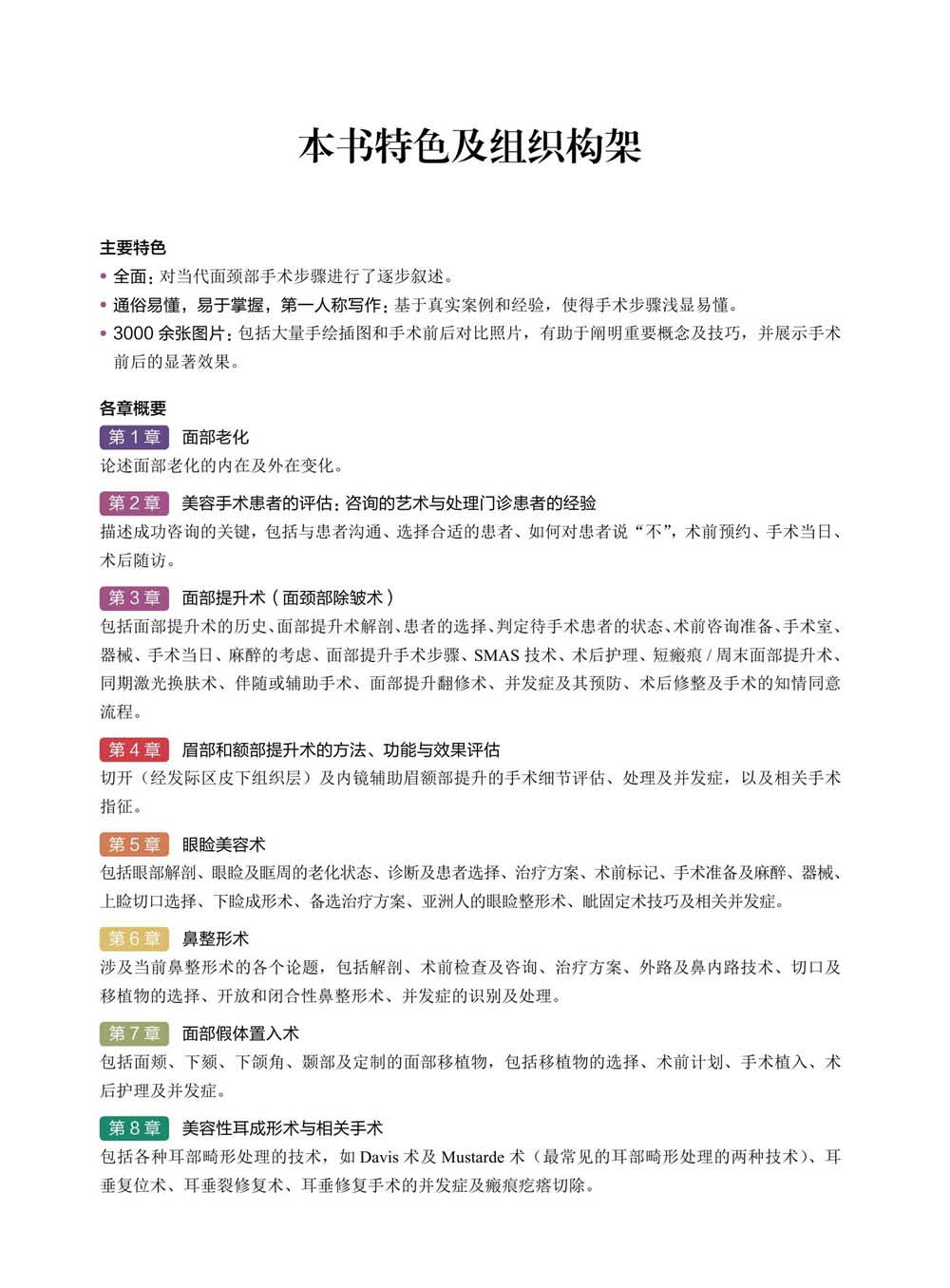本書引進自世界知名的ELSEVIER出版集團,是一部全面介紹當代面部美容外科學的經典教科書。 本書為全新第2版,共15章。 書中所述均基於真實病例及術者經驗,並配有3000餘張手術前後高清照片及手繪插圖,生動描述了面部美容手術過程中的各項操作,同時闡明了重要概念及技巧,使手術步驟闡釋淺顯易懂。 著者在面頸部提升、眶周年輕化、假體移植、脂肪移植、微創美容等方面有獨特的觀點與科技,在很多手術方面的一些小技巧也非常實用,特別是有關年輕化的內容,是著者在大量實踐與創新基礎上的理論總結,對國內從事醫療美容工作的醫生很有幫助。 本書內容翔實、闡釋簡明、圖表豐富,既可作為住院醫生和低年資外科醫生的指導書,又可作為中、高級外科醫生瞭解新技術的參考書。