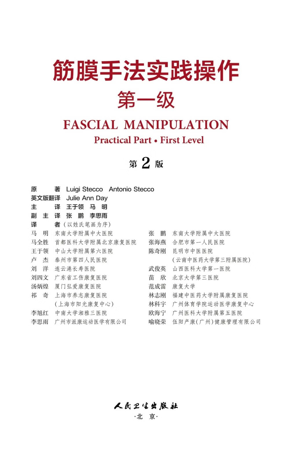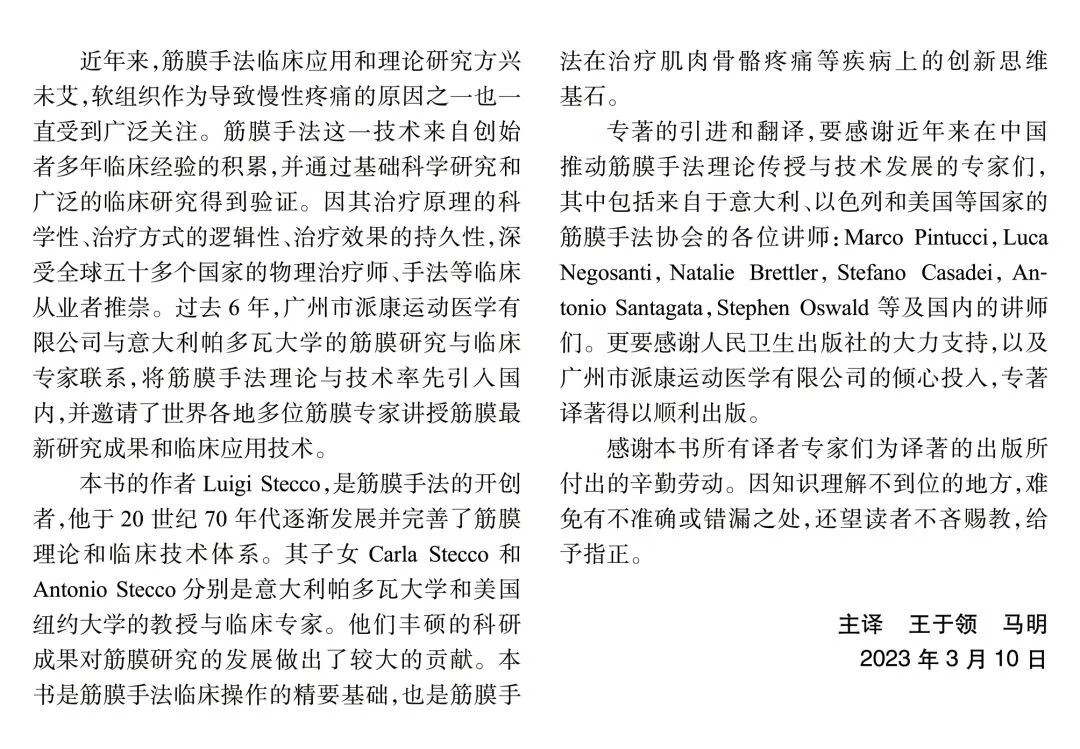 由Luigi Stecco和Antonio Stecco著,王於領、馬明教授主譯的《筋膜手法實踐操作·第一級》(第2版)經過全面的更新和修訂,翔實闡述了筋膜手法臨床應用的理論基礎和實踐操作指南。 介紹了筋膜解剖學、生理學和筋膜手法科技獨有的生物力學模型,動作測試以及筋膜手法治療的點比特和操作方法。 全書共9章,依據解剖部位,從筋膜系統全面介紹了上肢、下肢、軀幹的CC點和治療方法,圖文並茂,翻譯準確且專業,具有較高的可讀性。