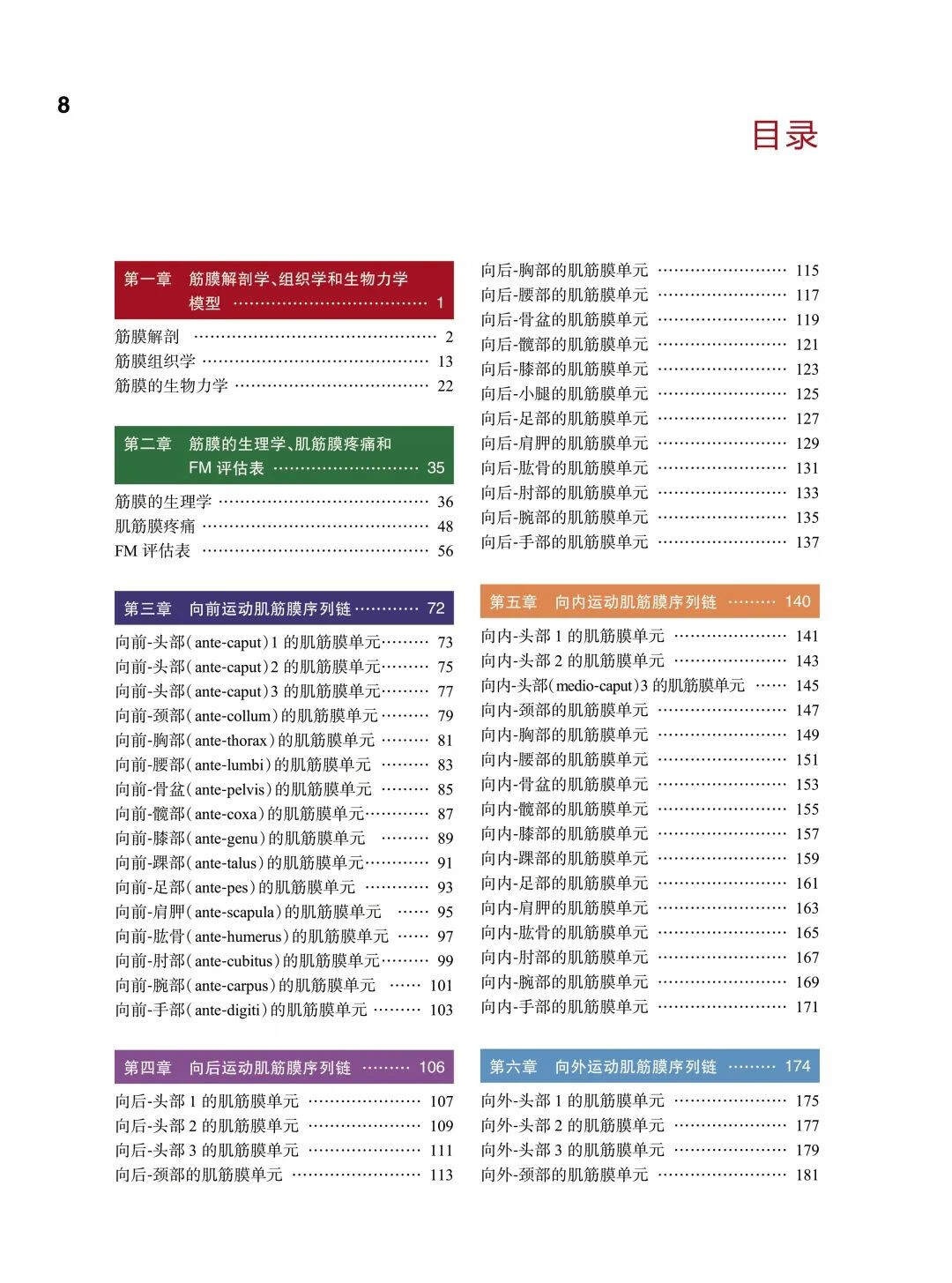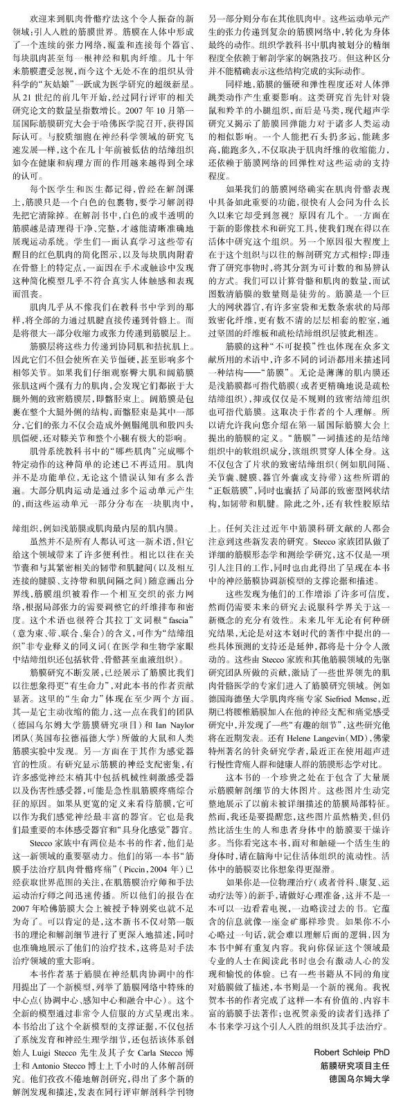 本書以科學的研究證據為基礎,全面介紹如何應用Luigi Stecco創建的筋膜手法。本書向手法治療師、醫師、患者、運動訓練教練及想要了解和學習筋膜手法的人介紹了關於筋膜的充足的知識。這本書內容排版很有邏輯性,前3章介紹了筋膜手法的發展歷史、筋膜解剖學( 第2 章) 和生理學( 第3 章),其他章節則主要圍繞筋膜手法技術展開,如第4 章重點介紹了筋膜手法的關鍵概念;第5 章結合了一些病例;第6 章主要提到內部功能障礙;第7 章講述獸醫應用筋膜手法。