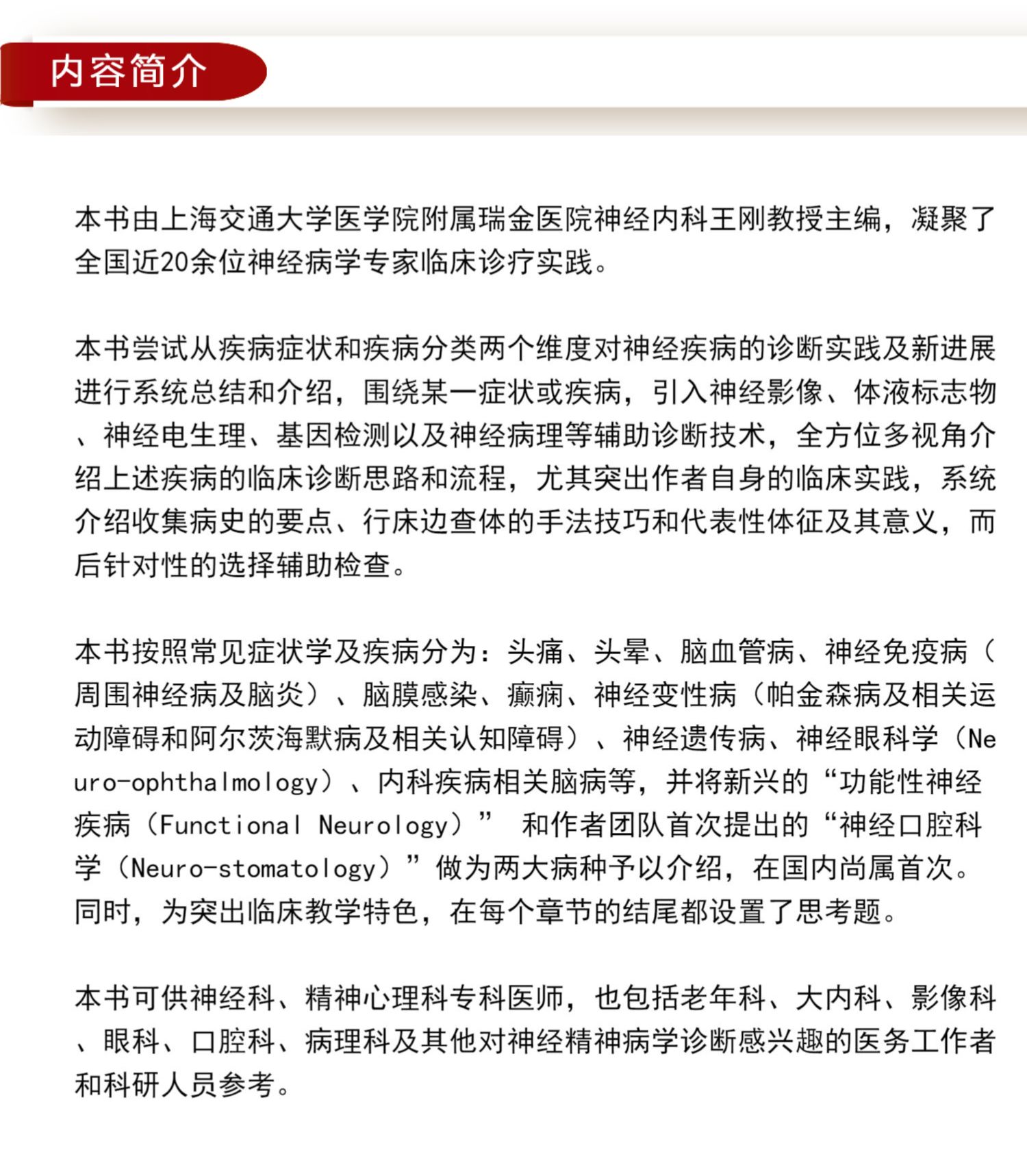 本書內容包括兩部分,第一章介紹了神經病學診斷的歷史源頭、發展及現狀; 第二章至第十六章分別介紹了頭痛的診斷思路、頭暈的診斷思路、腦血管疾病的診斷思路、運動障礙的診斷思路、認知障礙的診斷思路、圍腦膜感染的診斷思路、自身免疫性腦炎的診斷思路、癲癇的診斷思路、慢性炎性脫髓鞘性神經根周圍神經病的診斷思路、肌病的診斷思路、 神經系統遺傳病的診斷思路、神經眼科疾病的診斷思路、神經口腔科疾病的診斷思路、功能性神經疾病的診斷思路、內科疾病相關腦病的診斷思路等。 本書內容豐富,層次清晰,論述嚴謹,適合神經精神內科醫師、普通內科醫師、眼科、口腔科及相關醫護人員使用。