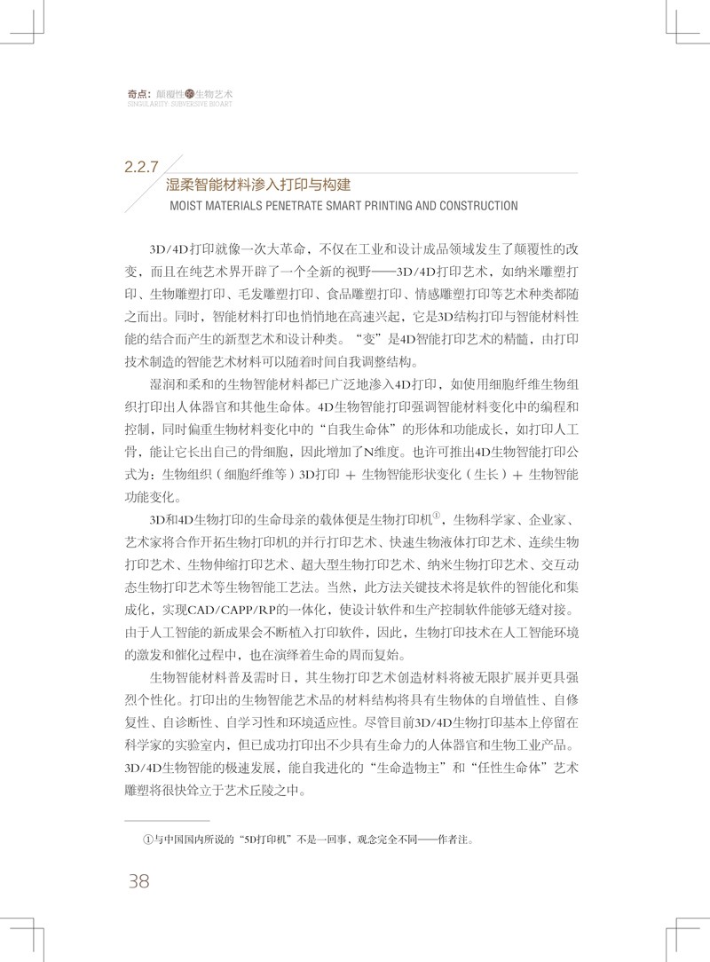 第5章:憧憬了4D智慧列印藝術在未來演變中的特殊品性; 剖析了各類智能材料在4D列印藝術中的應用前景,以及列印出任何資料和狀態藝術品的可能性。