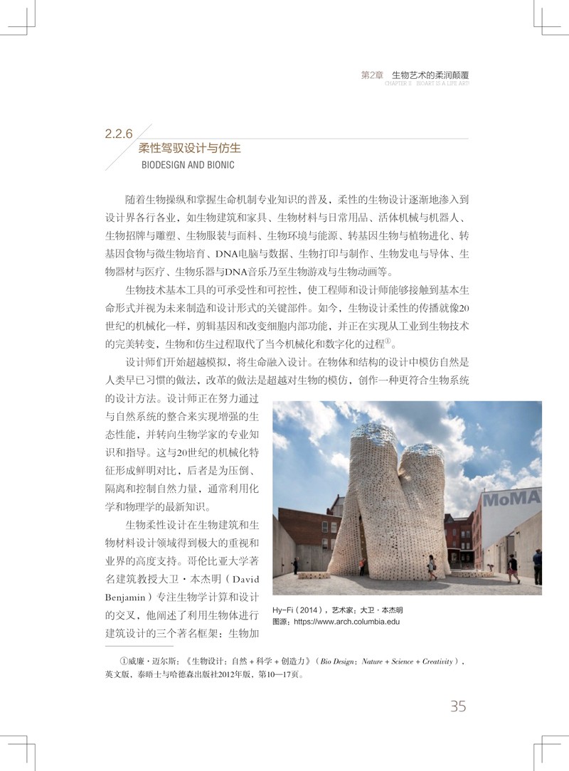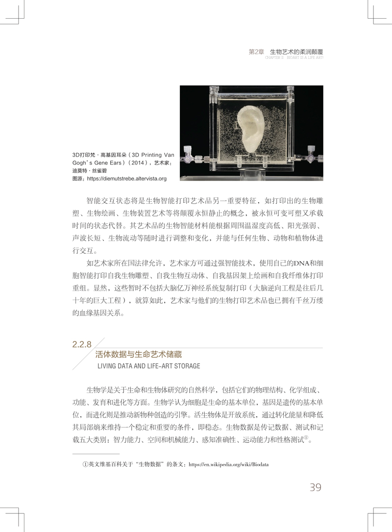 第2章:演繹了生物藝術的狹義與廣義定義; 推求了全新生命結構下生物藝術的柔濕顛覆與突變形態、操縱生命中的可塑過程、活體數據與生命藝術儲藏特色; 論述了生物智慧重構藝術、藝術家與創造力的內涵,以及生物藝術中濕潤生命體對未來美學的衝擊; 鋪陳了社會道德爭議下生物藝術的困境與挑戰; 憧憬了未來關鍵生物技術擴展類型與趨勢。