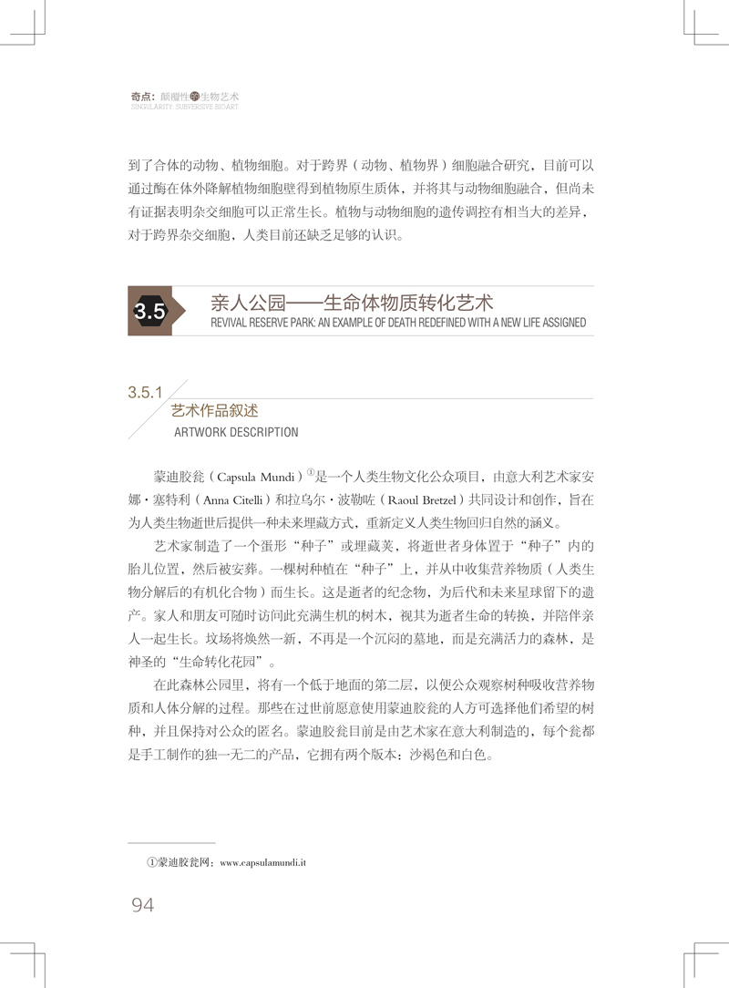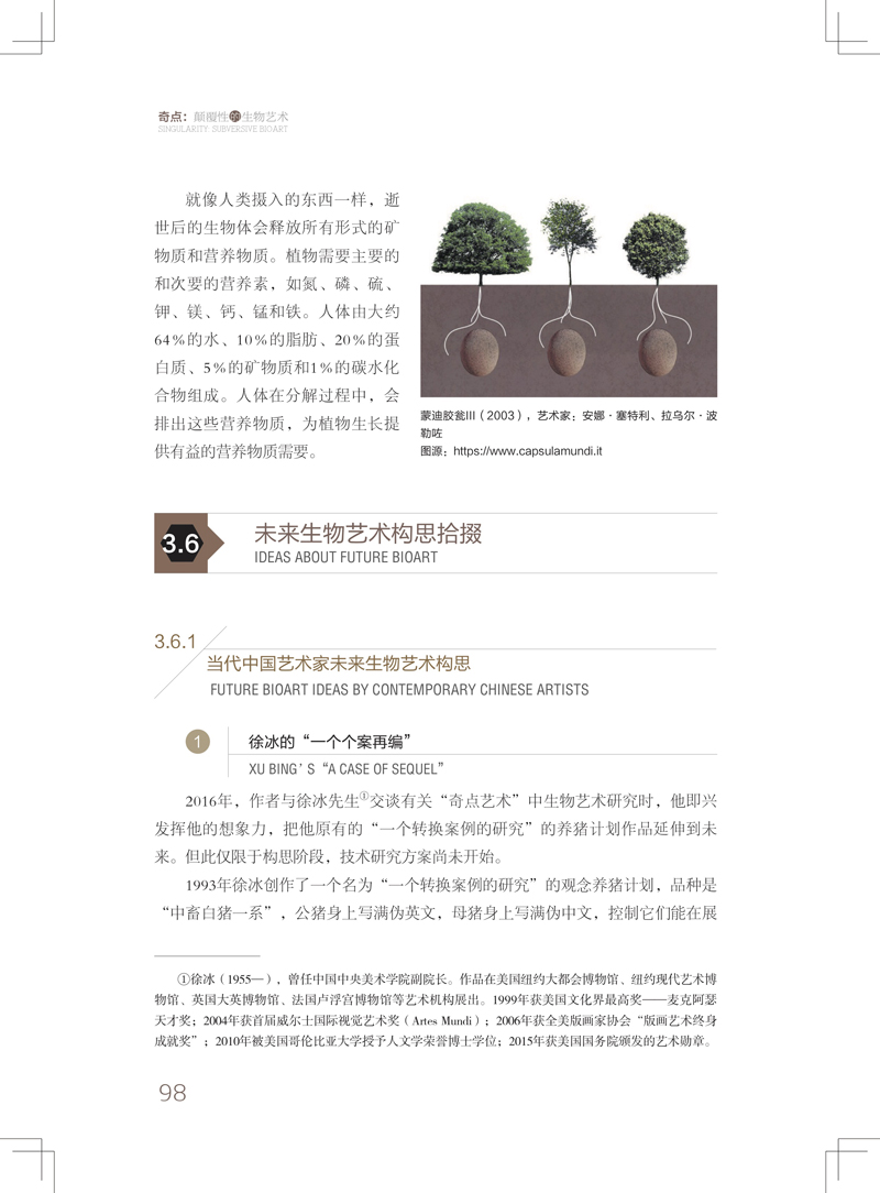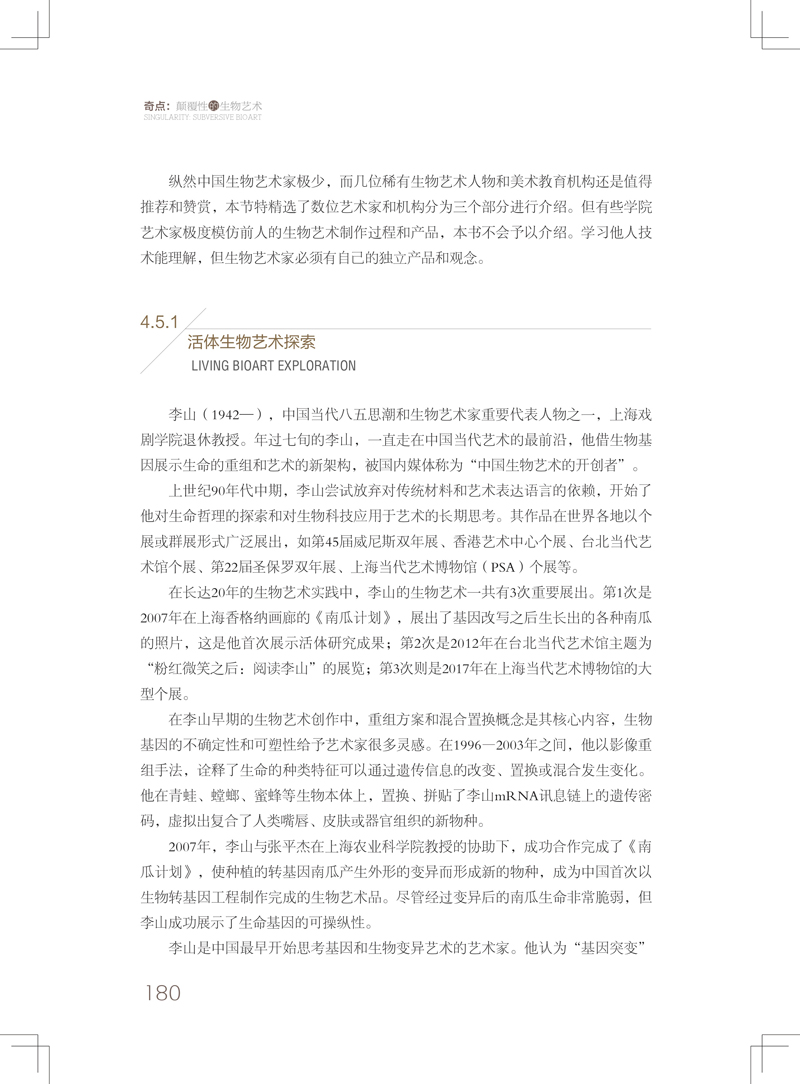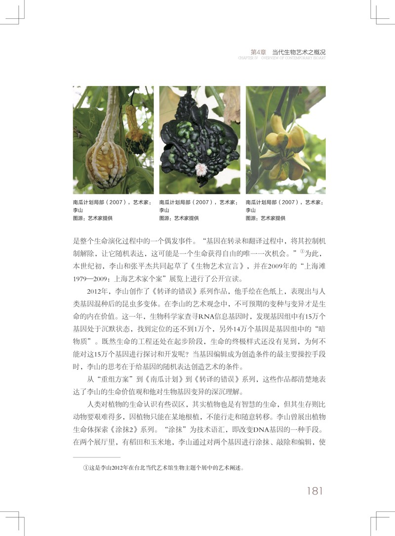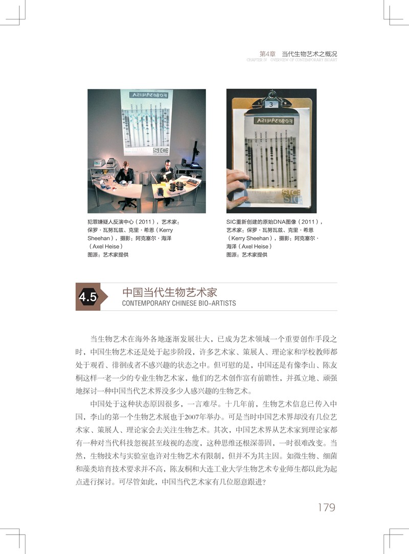 第4章:主要簡介了中國和世界當代生物藝術之概況。 從生物技術性質和生物藝術展示特質上,給予了詳備而細緻的歸納和分類,對生物技術和藝術兩者的平行推薦闡揚都非常到位。