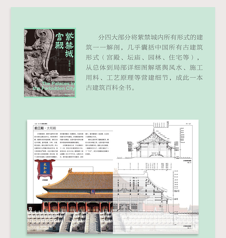 《紫禁城宮殿》分四大部分將紫禁城內所有形式的建築一一解剖,幾乎囊括中國所有古建築形式(宮殿、壇廟、園林、住宅等),從總體到局部,詳細圖解堪輿風水、施工用料、工藝原理等營建細節,成此一本古建築百科全書。