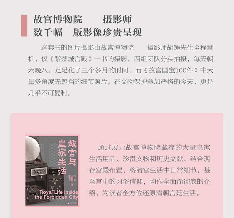*600幅珍貴圖片,30餘幅建築實測墨線圖,故宮博物院予以前所未有的拍攝支持,將那些深藏在皇宮大院的隱秘角落一一揭開,大到宮室戲台,小到燭台暖爐,纖毫畢現,真正在故宮內實現拍攝「無禁區」。