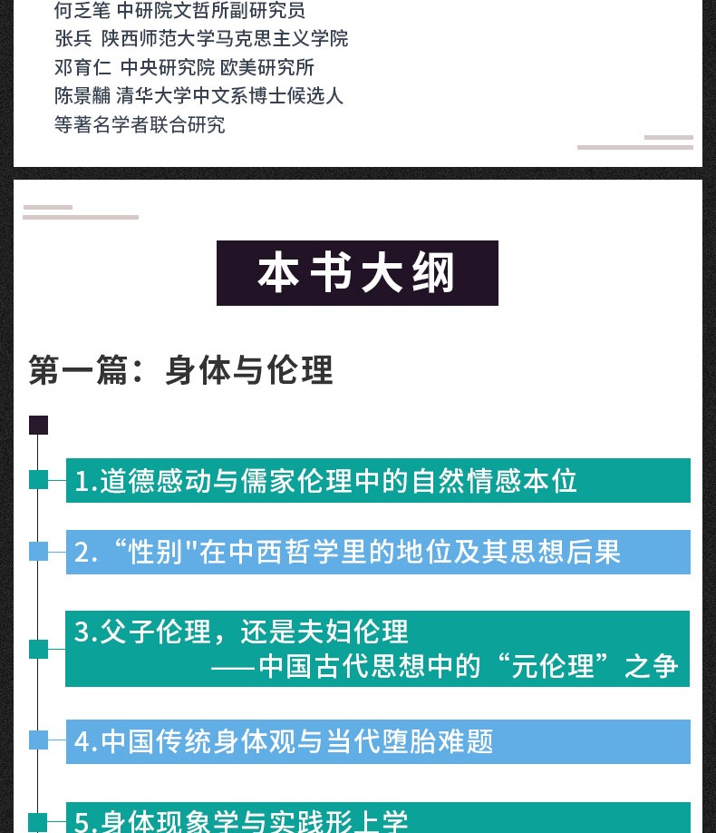 本書從「身體」概念的角度探討中國哲學,論文作者來自兩岸三地,全書共十七篇,分成四個部分:(一)身體與倫理、(二)體感與體知、(三)身體與語文、(四)前瞻與反思,*面性地反思了中國身體哲學在當代的處境。相較於當代新儒家強調天道性命相通的主體性哲學,本論文集注重道德感受與倫理實踐的身體依據,全書顯示一種新的具體哲學的走向。
