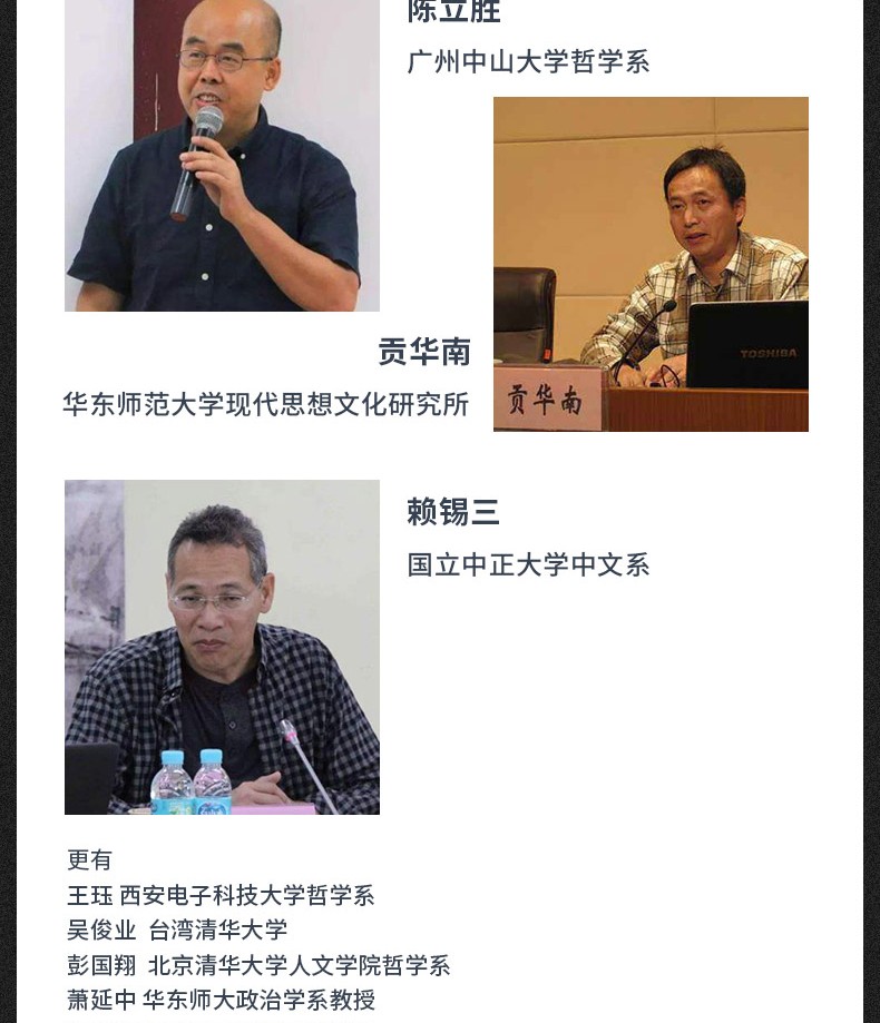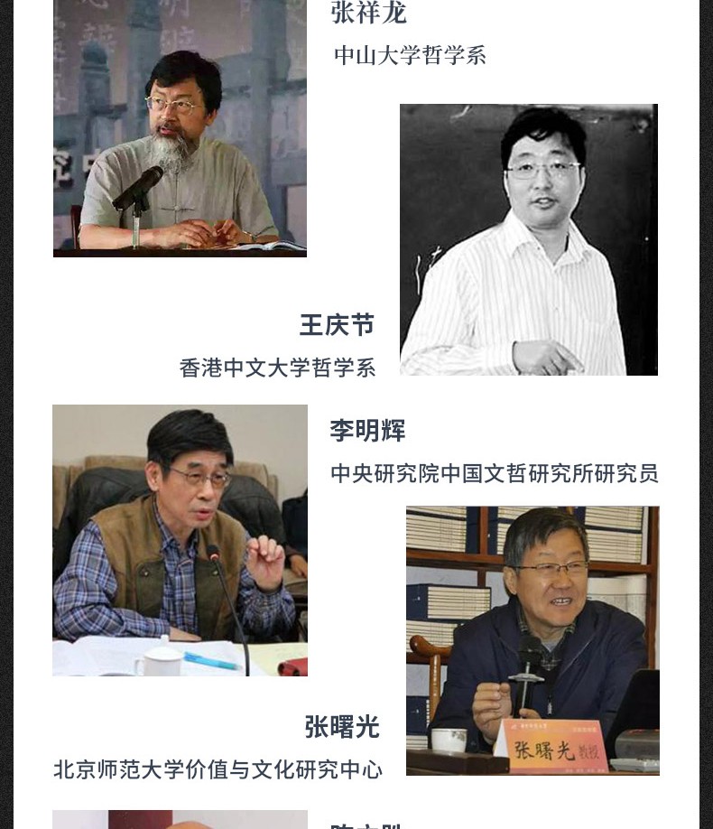 楊儒賓:現任清華大學中國文學系講座教授。主要研究領域為先秦哲學、宋明理學、東亞儒學等。著作有《儒家身體觀》、《異議的意義:近世東亞的反理學思潮》、《從〈五經〉到〈新五經〉》、《1949禮讚》、《儒門內的莊子》等。