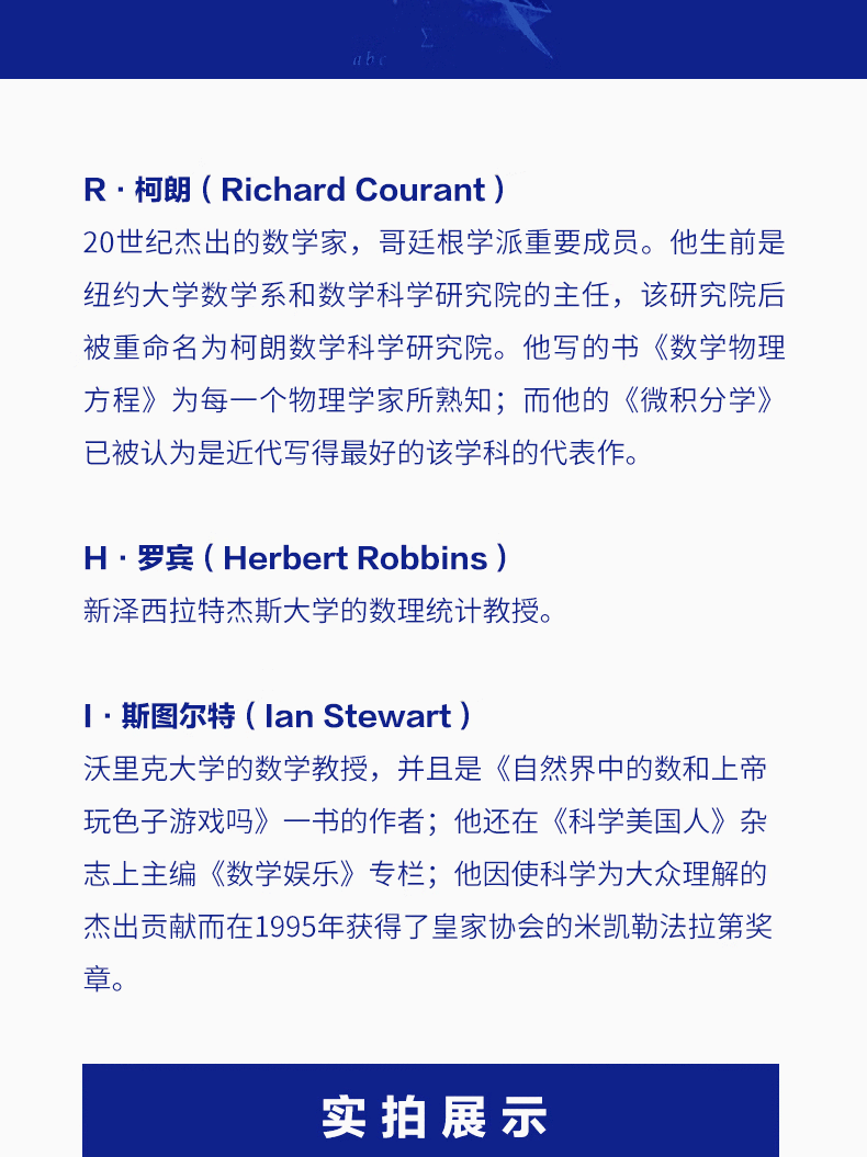 [美]R.柯朗(Richard Courant)是20世紀傑出的數學家,格丁根學派重要成員。 他生前是紐約大學數學系和數學科學研究院的主任,該研究院後被命名為柯朗數學科學研究院。 他寫的書《數學物理方程》為每一個物理學家所熟知,而他的《微積分學》已被認為是近代寫得好的該學科的代表作。