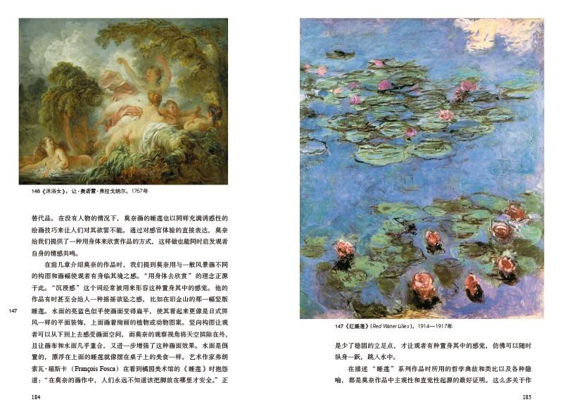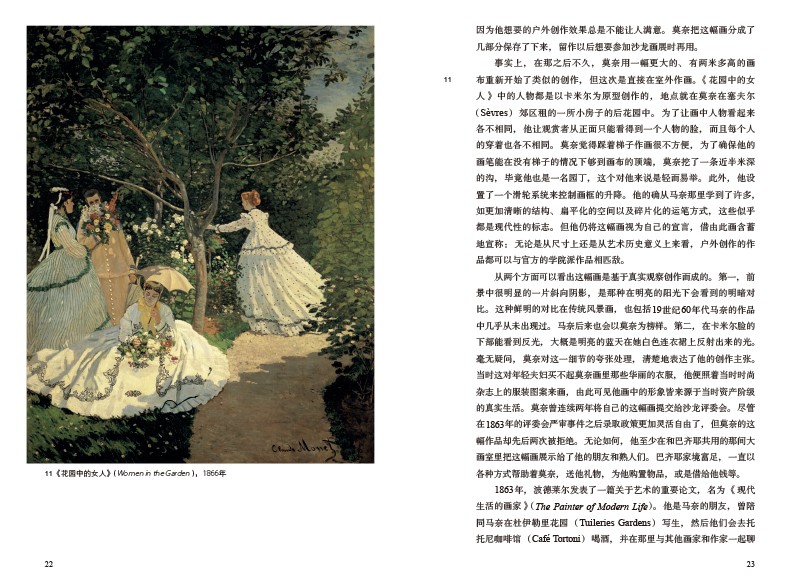 世界知名的19世紀法國藝術史學家詹姆斯•H.魯賓從三點上補充了對莫奈藝術已有的研究。首先通過對159幅關鍵作品的研究,追溯了莫奈藝術的發展歷程,解讀了莫奈作品為繪畫藝術帶來的革命性影響。其次,分析了莫奈所處的社會和政治環境以及文化潮流對其藝術產生的影響,包括引發他政治生涯的烏托邦思想,以及他對日本版畫和園藝的興趣等。還介紹了莫奈與同時代畫家的關係,如馬奈和雷諾阿等。