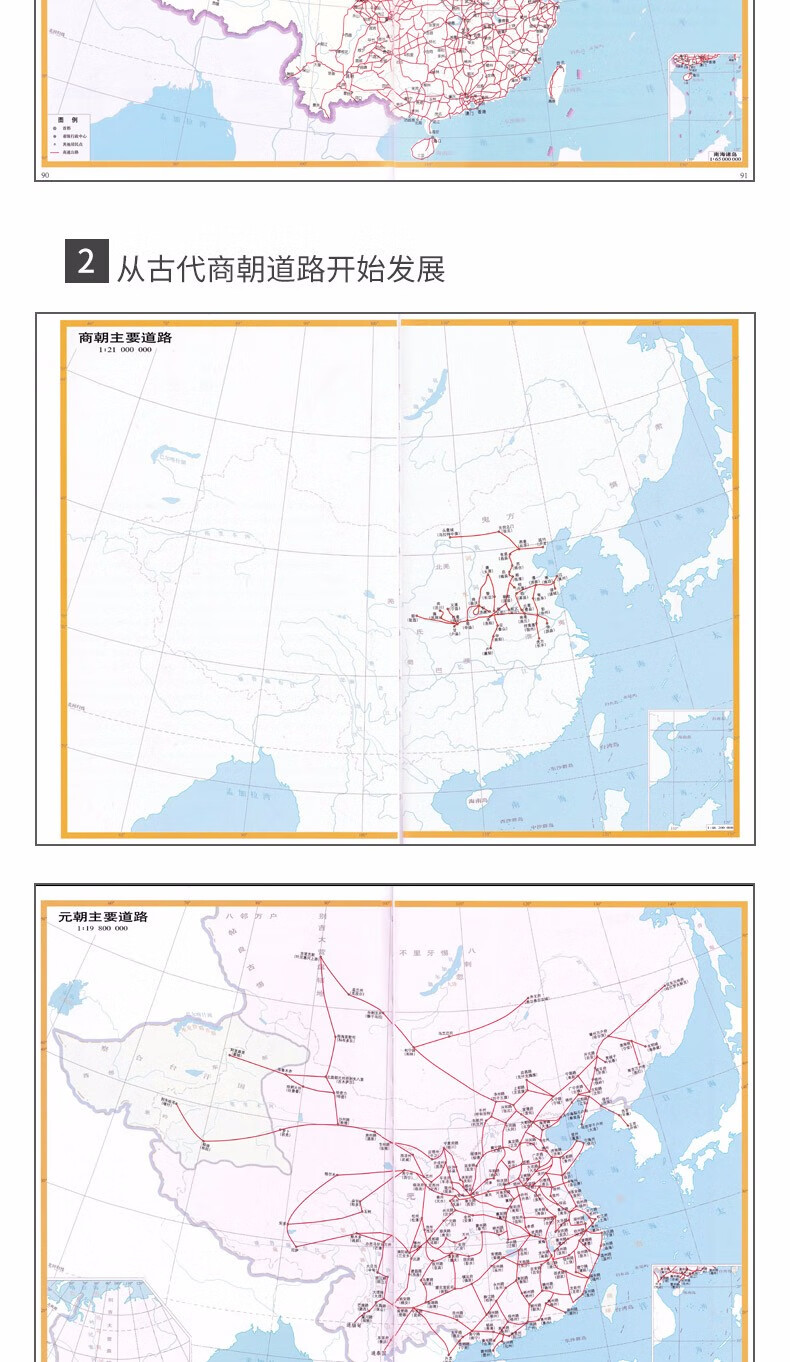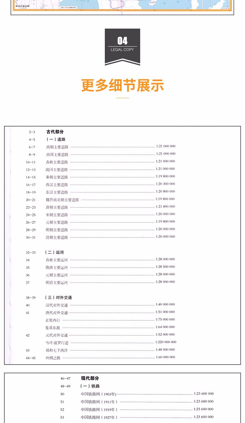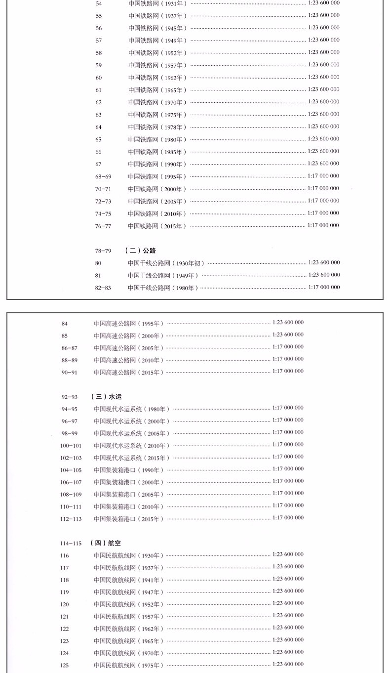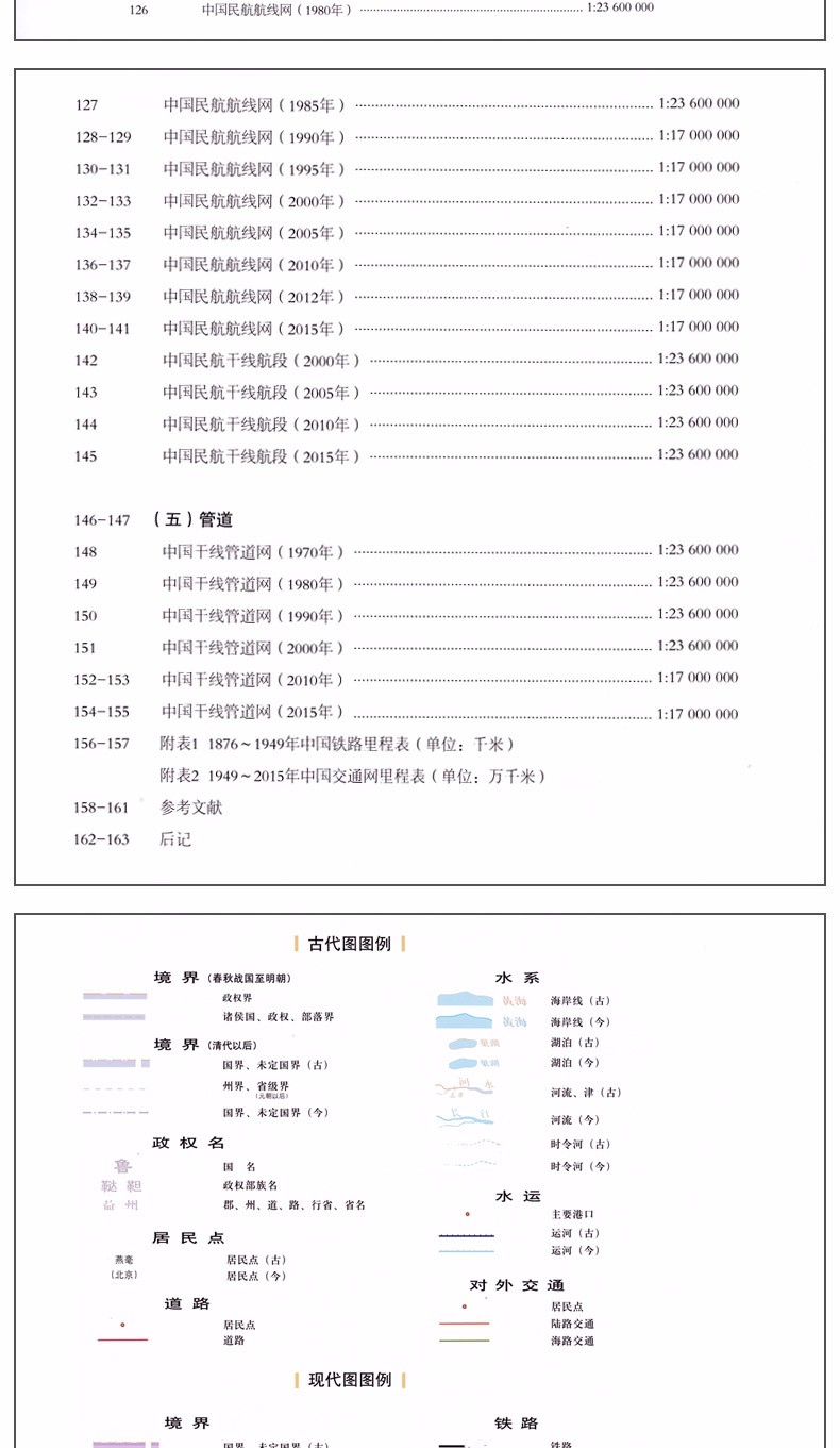 2-3古代部分4-5(一)道路6商代主要道路………………………………………………………………………………………………. 1:27 000 000 7周主要道路………………………………………………………………………………………………….. 1:27 000 000 8春秋主要道路………………………………………………………………………………………………. 1:27 000 000 9戰國主要道路………………………………………………………………………………………………. 1:27 000 000 10秦朝主要道路………………………………………………………………………………………………. 1:27 000 000 11西漢主要道路………………………………………………………………………………………………. 1:27 000 000 12東漢主要道路………………………………………………………………………………………………. 1:27 000 000 13魏晋南北朝主要道路……………………………………………………………………………………. 1:27 000 000 14唐代主要道路………………………………………………………………………………………………. 1:27 000 000 15宋代主要道路………………………………………………………………………………………………. 1:27 000 000 16元代主要道路………………………………………………………………………………………………. 1:27 000 000 17明代主要道路………………………………………………………………………………………………. 1:27 000 000 18清代主要道路………………………………………………………………………………………………. 1:27 000 000 20-21(二)水運22春秋時期的水運…………………………………………………………………………………………… 1:27 000 000 23隋代的水運…………………………………………………………………………………………………. 1:27 000 000 24唐代的水運…………………………………………………………………………………………………. 1:27 000 000 25北宋的水運…………………………………………………………………………………………………. 1:27 000 000 26元代的水運…………………………………………………………………………………………………. 1:27 000 000 27明清的水運(用清朝圖)………………………………………………………………………………….. 1:27 000 000 28-29(三)中外交通30漢代對外之路(草原絲綢之路)…………………………………………………………………… 1:27 000 000 31唐代中外交通(玄奘西行和鑒真東渡)…………………………………………………………. 1:27 000 000 32元代中外交通(馬可孛路路線)…………………………………………………………………… 1:27 000 000 33明清中外交通(鄭和航海圖)………………………………………………………………………. 1:27 000 000 34陸上和海上絲綢之路……………………………………………………………………………………. 1:27 000 000 36-37現代部分38-39(一)鐵路40 1903年鐵路網……………………………………………………………………………………………….. 1:23 600 000