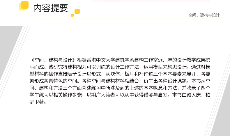 《空間、建構與設計》根據香港中文大學建築學系建構工作室近幾年的設計教學成果撰寫而成。 該研究將建構視為可以訓練的設計工作方法,運用模型來構思設計。 通過對模型資料的操作直接賦予設計以形式,從塊體、板片和杆件這三個基本要素來展開,各要素形成各具特色的空間。 各種空間與建構資料相結合,衍生出各種設計課題。 《空間、建構與設計》從空間、建構和方法三個方面闡述練習中所涉及到的上述的基本概念和方法,並收錄了四個學生練習以相關操作步驟,以期廣大讀者可以從中獲得借鑒與啟發。