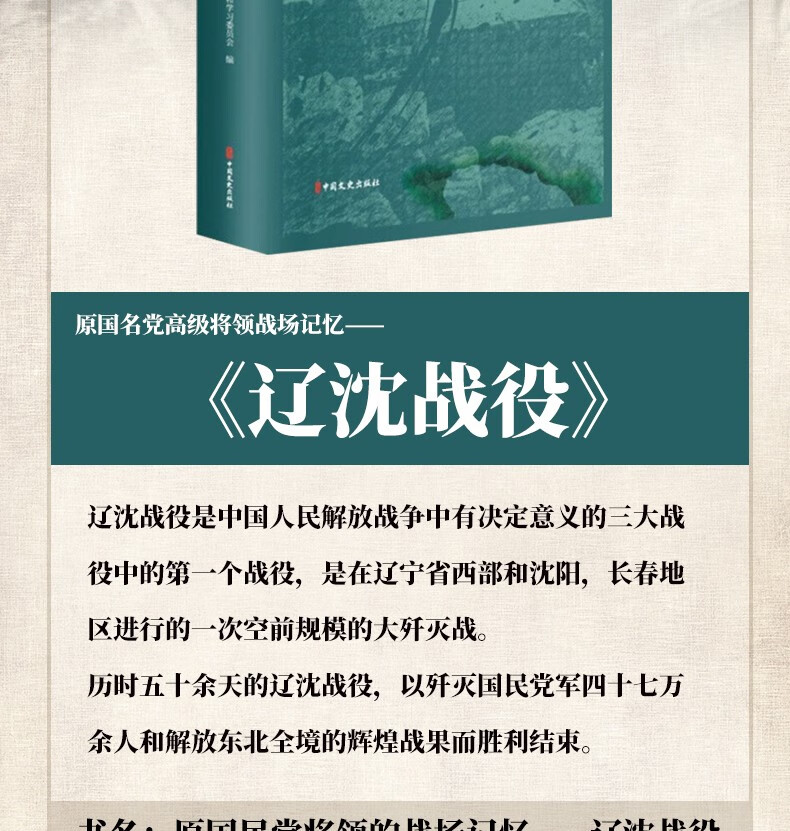 遼沈戰役是解放戰爭三大戰役之一。 《遼沈戰役(原國民黨高級將領的戰場記憶)》收錄了曾參加遼沈戰役的國民黨高級將領,如範漢傑、廖耀湘、鄭洞國等人,對該戰役的回憶。 分為全戰役概述、錦州戰役、遼西戰役、增援錦州、長春起義、瀋陽解放、營口葫蘆島撤逃等章。 並附有國民黨軍作戰序清單和戰役地圖。 比較全面、詳細地記錄下了國民黨軍視角下的遼沈戰役。