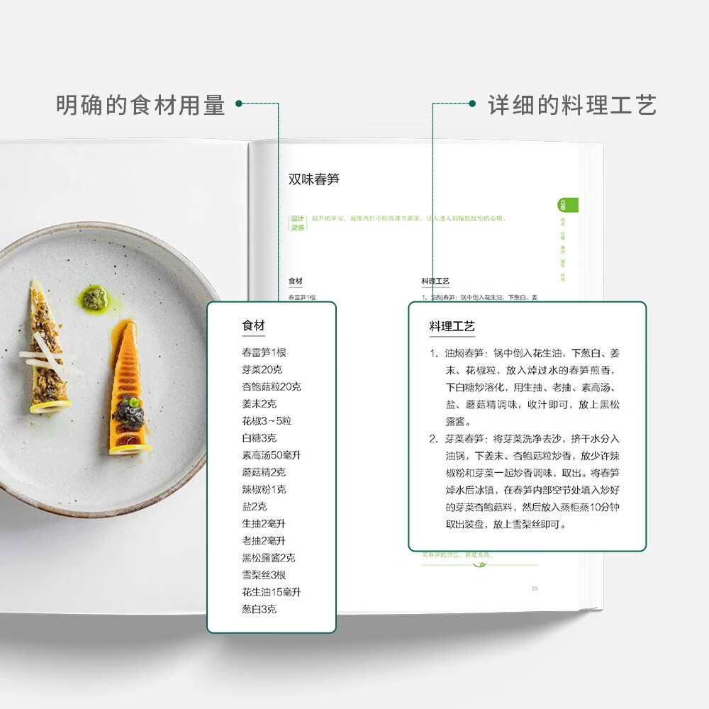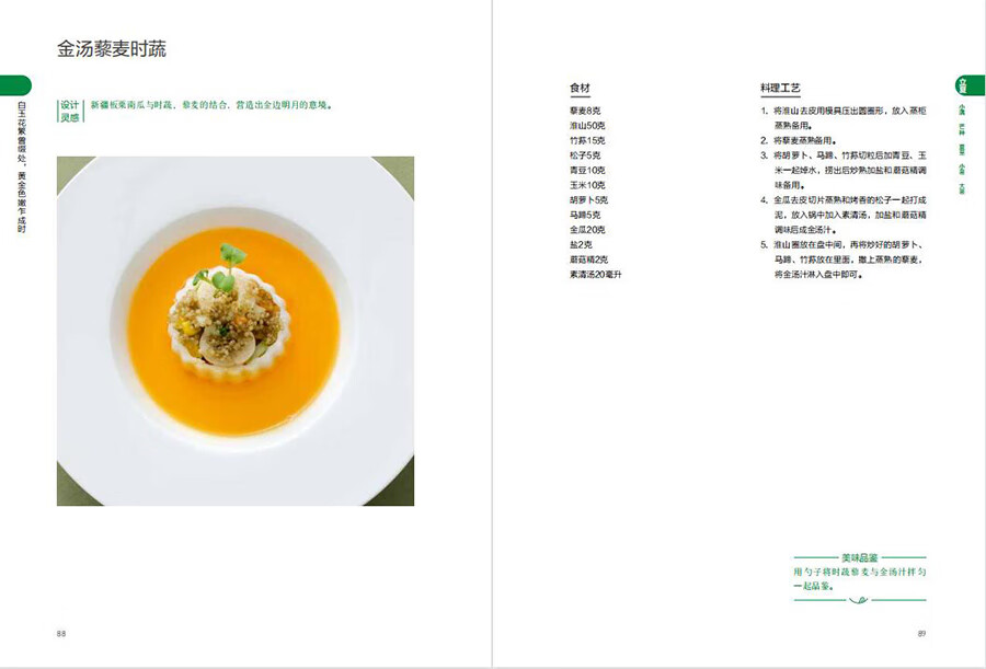 本書按照二十四節氣對菜品進行分類,精選應季新鮮食材進行飲食搭配,通過圖片和文字相結合,分步驟詳細講述了每一道素食菜品的製作過程,專業的烹飪技法讓素食別有風味,精美的裝盤給專業素食從業人員打開了創意的思路。 本書實用性與藝術性相結合,食材多樣性和傳統飲食文化相結合,呈現了作者對素食的新認識和新理解。