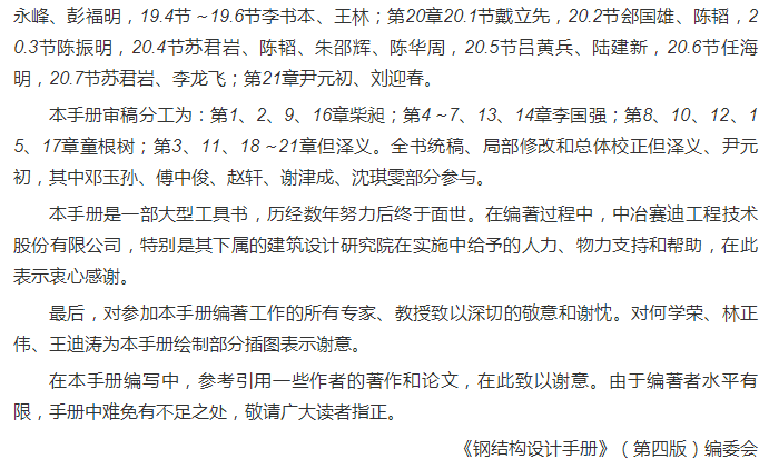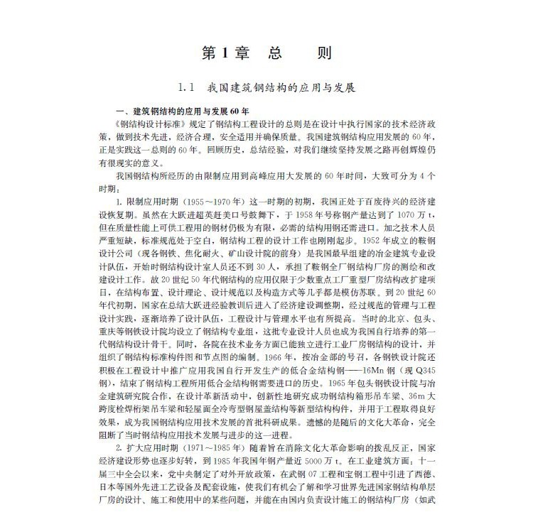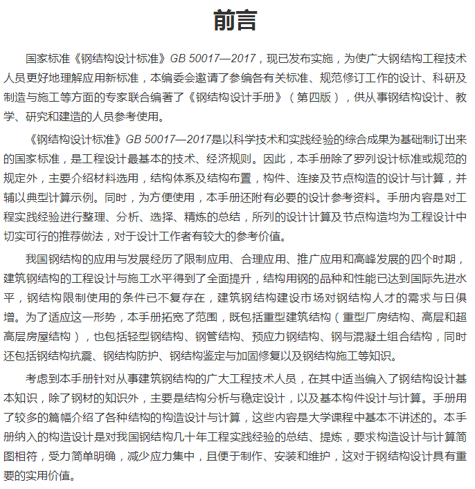第四版內容包括:結構體系、材料選用、結構分析、單層與多層廠房鋼結構、多層與高層鋼結構、門式剛架、壓型鋼板輕鋼圍護結構、節點設計、塑性設計、抗震設計、鋼管結構、預應力鋼結構、組合結構、鋼結構防護、鋼結構檢測、鑑定與加固、鋼結構施工技術要求、設計參考資料等。