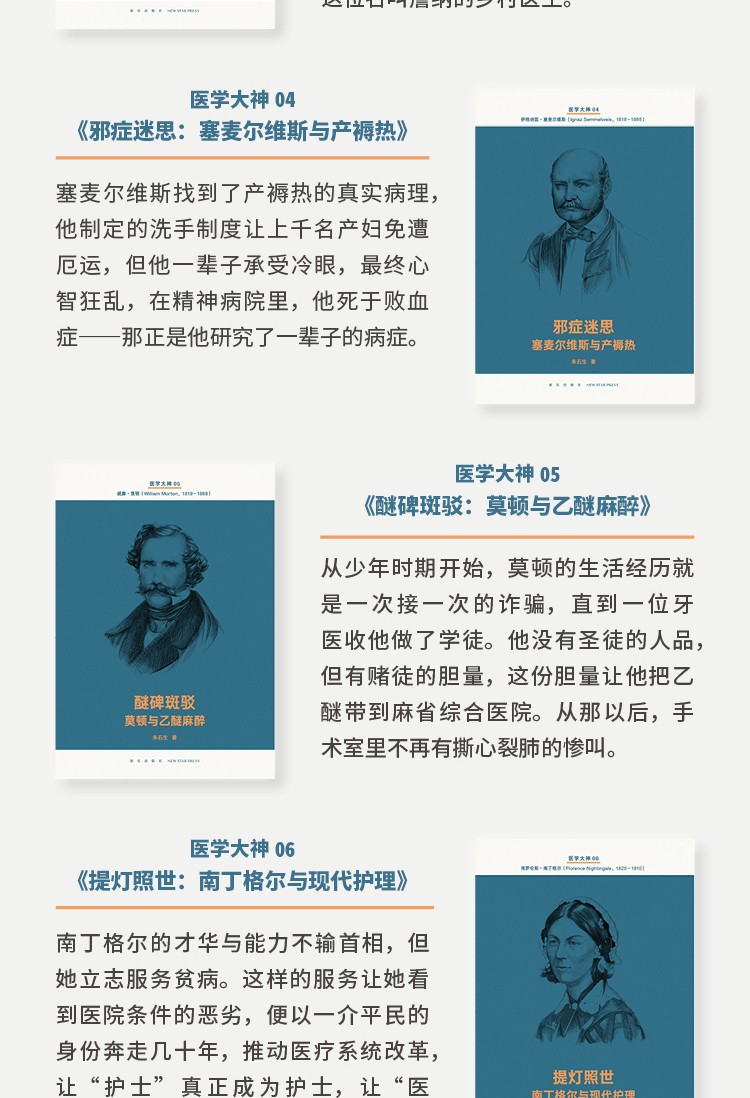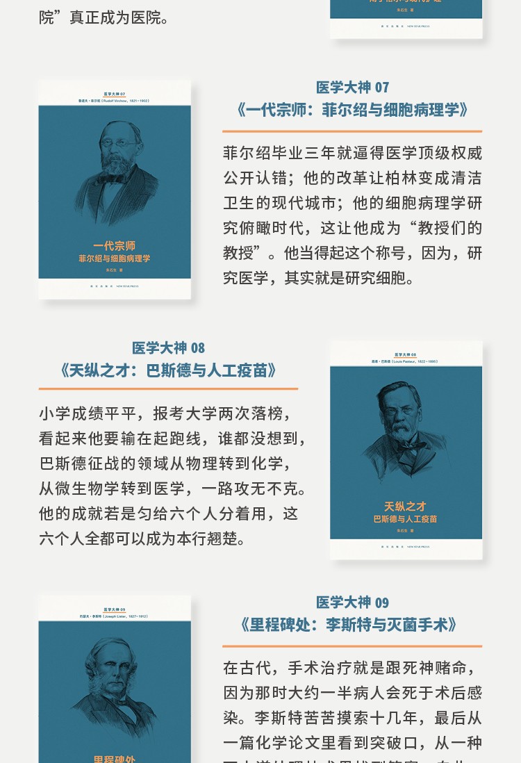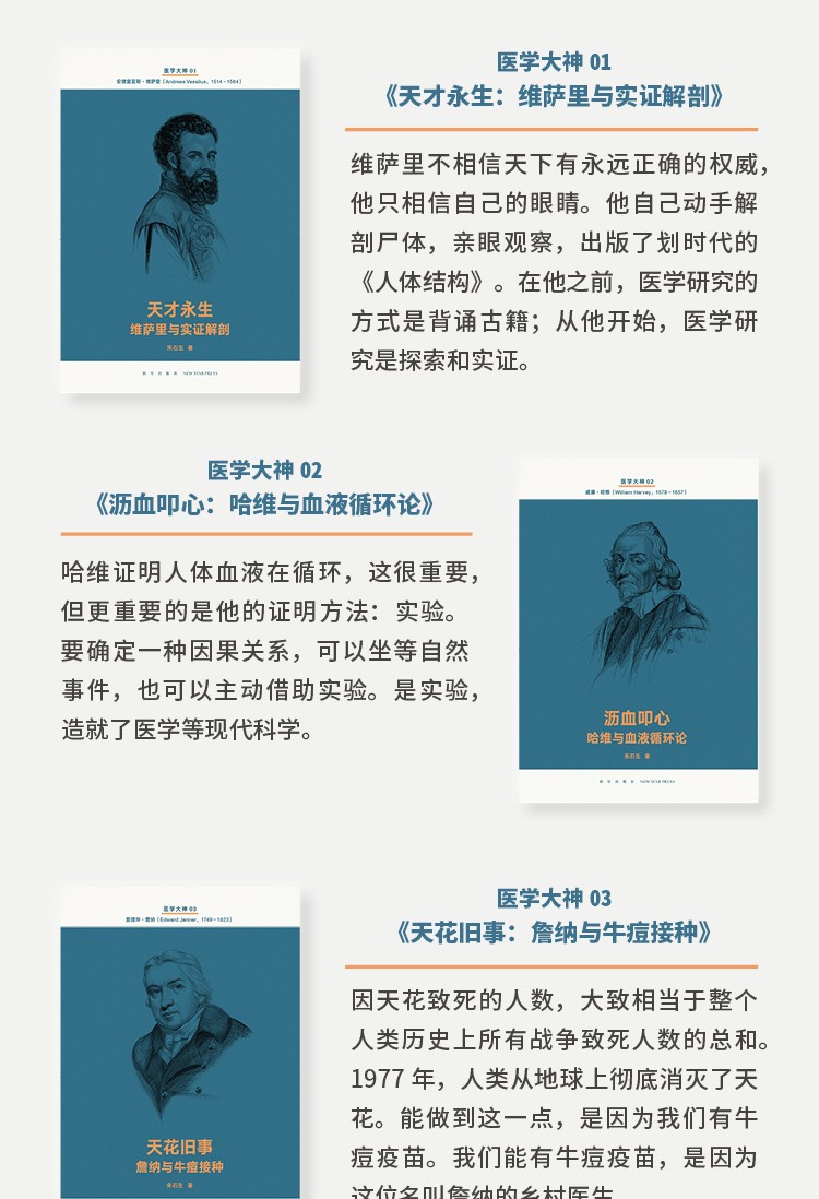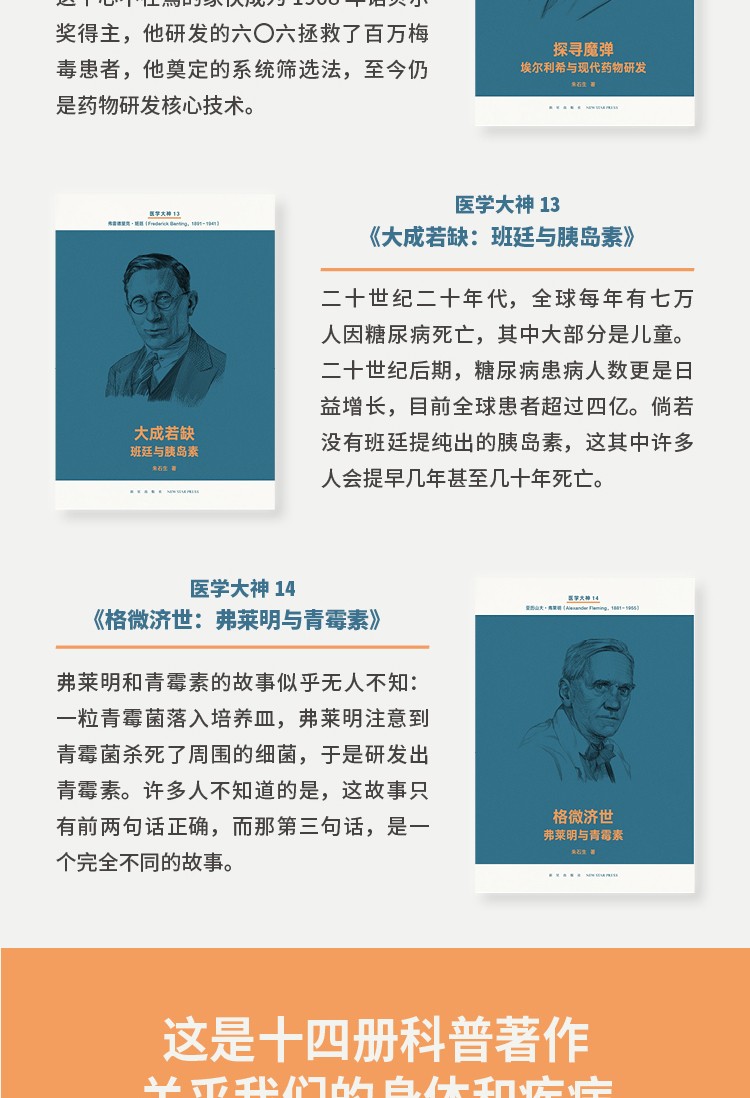 「醫學大神」指的是曾為現代醫學發展做出劃時代貢獻的十四位人類巨子,他們拯救了人的生命,更點亮了我們的頭腦.14冊、80萬字,每冊近20部參考文獻,關乎我們的身體和疾病.