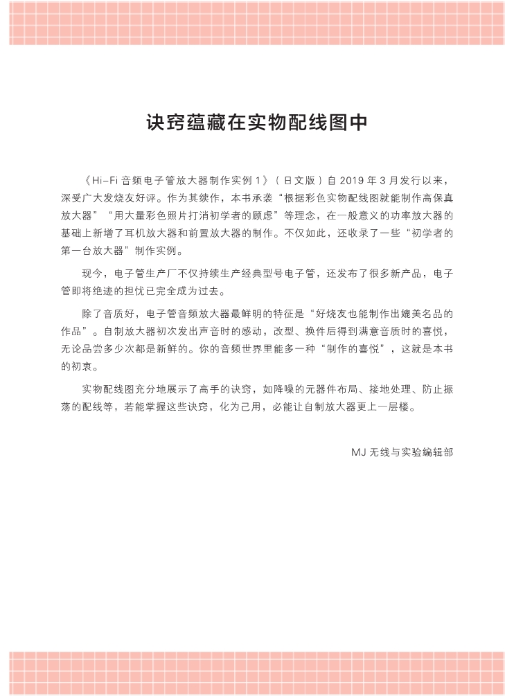 《Hi-Fi音頻電子管放大器制作實例.1》始終堅持用彩色實物配線圖和彩色實景照片展現元器件裝配方法和配線技巧,旨在傳承面臨斷代的電子管功率放大器製作經驗、訣要,內容包括但不限於設計理念、電路特點、元器件選型、製作步驟、特性量測、電路調試、試聽總結。