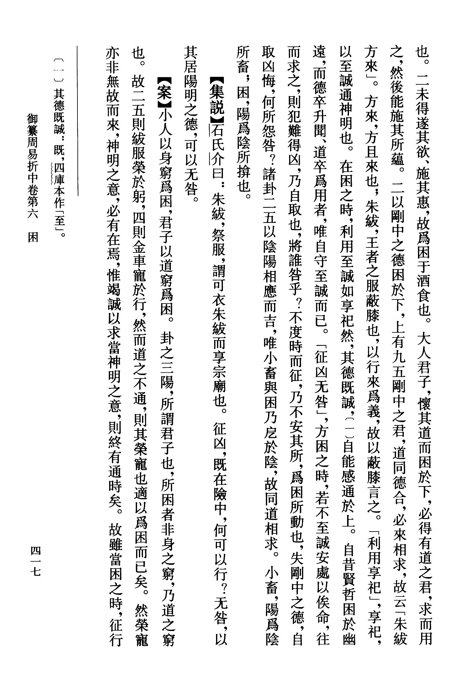 周易折中全依朱熹周易本義二經十翼之舊,奉旨“以本義為主,次及程傳”,輔以“集說”“總論”“案”,博採眾家之說。據書首開列的引用先儒統計,共計引用易學著作達二百一十八家,並時出己見,評判諸家之說,不乏創見,因此堪稱義理派易學的集大成之作,是清代官修諸書中的佼佼者。