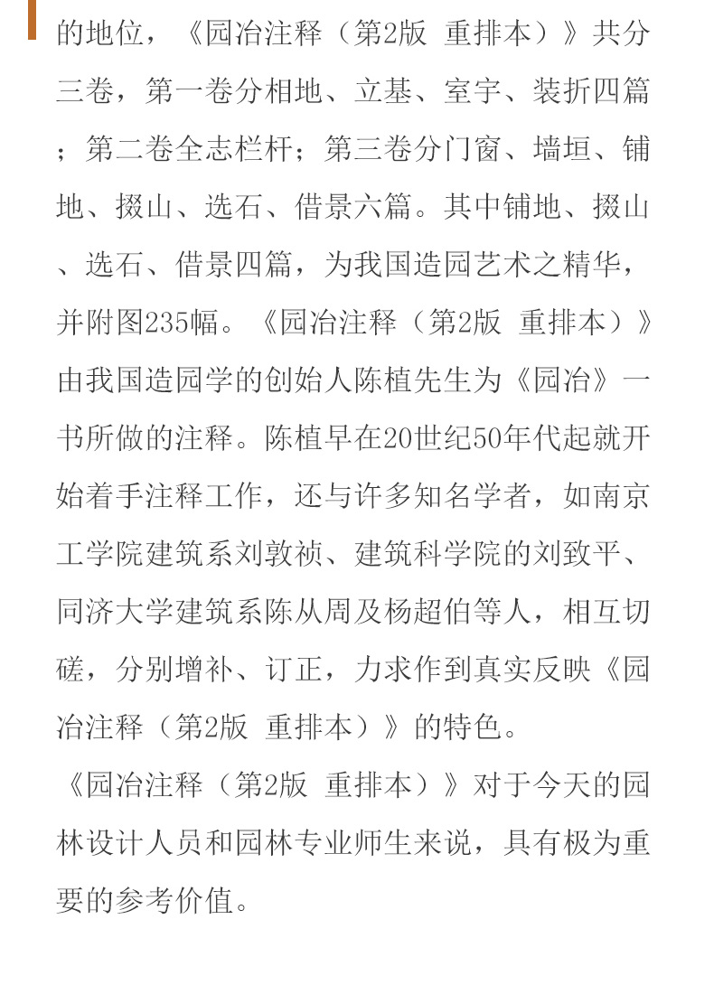 《園冶註釋(第2版 重排本)》對於今天的園林設計人員和園林專業師生來說,具有極為重要的參考價值。