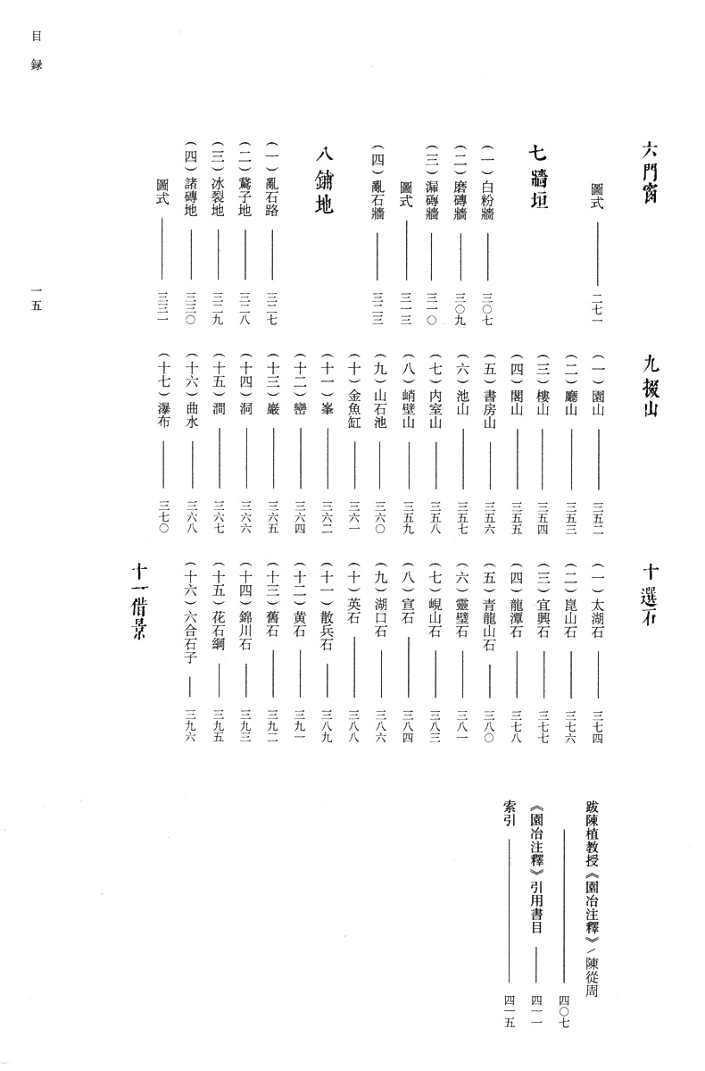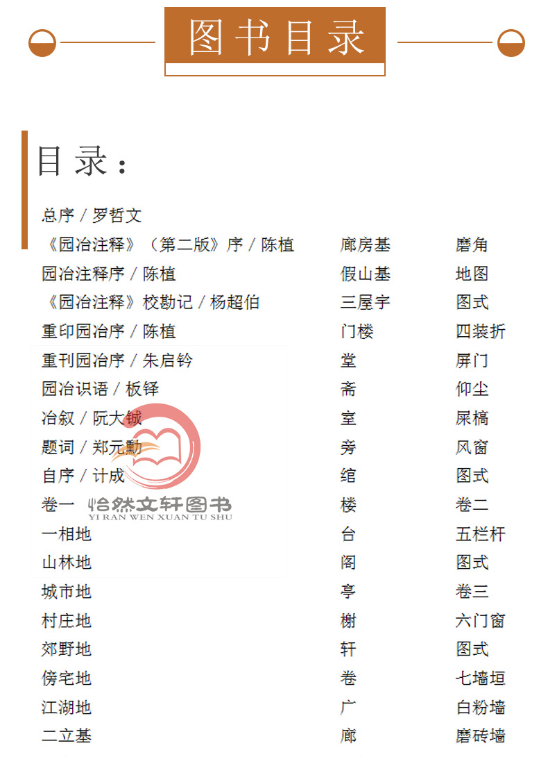 《園冶》在中國古代造園史上有著極為崇高的地位,《園冶註釋(第2版 重排本)》共分三卷,第一卷分相地、立基、室宇、裝折四篇;第二捲全志欄杆;第三卷分門窗、牆垣、鋪地、掇山、選石、借景六篇。其中鋪地、掇山、選石、借景四篇,為我國造園藝術之精華,並附圖235幅。
