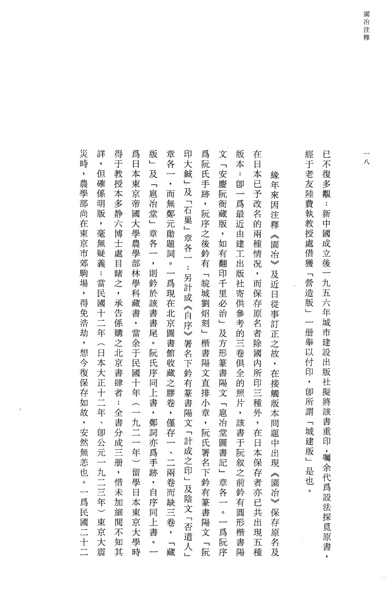晚明造園家計成所著《園冶》成書於崇禎四年(1631年),刊行於崇禎七年(1634年),是現存中國古代**一部造園專著,在中國園林史上具有不可替代的地位,是得窺中國古代造園理法的必讀文獻;被日本造園界人士譽為“世界造園學*古名著”,彌足珍貴。 《園冶》自清代傳入日本後,於國內漸趨失傳。直至1930年代,中國營造學社朱啟鈐、闞鐸等人,以北京圖書館所購明版《園冶》殘本,與日本內閣文庫藏本參照校錄、分別句讀,將該書付印出版。營造本《園冶》成為陳植、上原敬二等中日造園學者註解、研究的參照。
