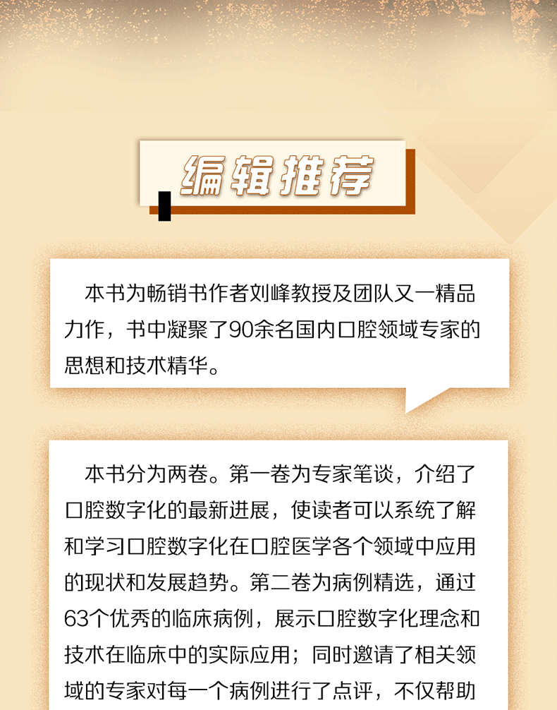 ★本書分為兩卷。 第一卷為專家筆談,介紹了口腔數位化的最新進展,使讀者可以系統瞭解和學習口腔數位化在口腔醫學各個領域中應用的現狀和發展趨勢。 第二卷為病例精選,通過63個優秀的臨床病例,展示口腔數位化理念和科技在臨床中的實際應用; 同時邀請了相關領域的專家對每一個病例進行了點評,不僅幫助讀者提煉了病例中最值得學習借鑒的理念、科技和臨床技巧,同時也指出了病例中尚存的遺憾、進一步提升的方向。