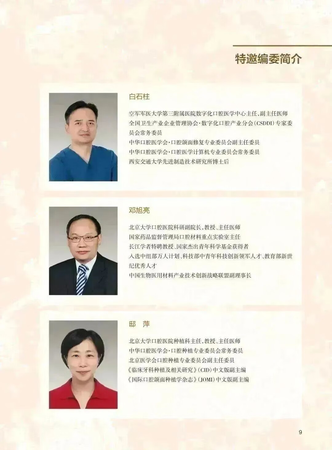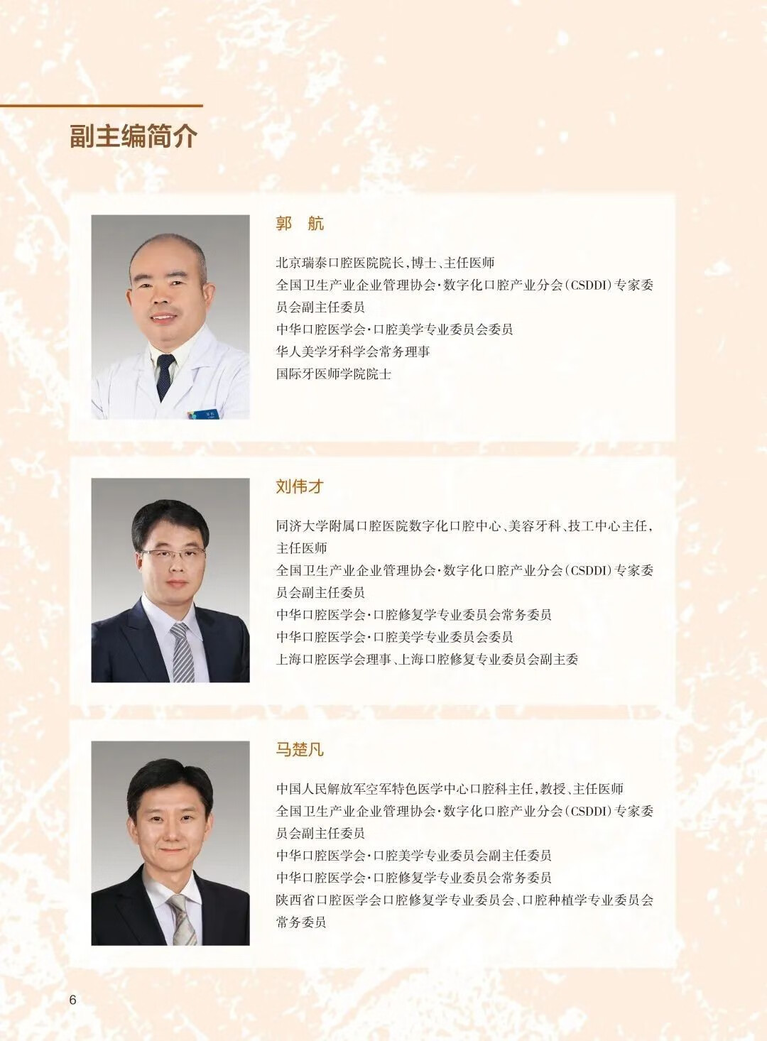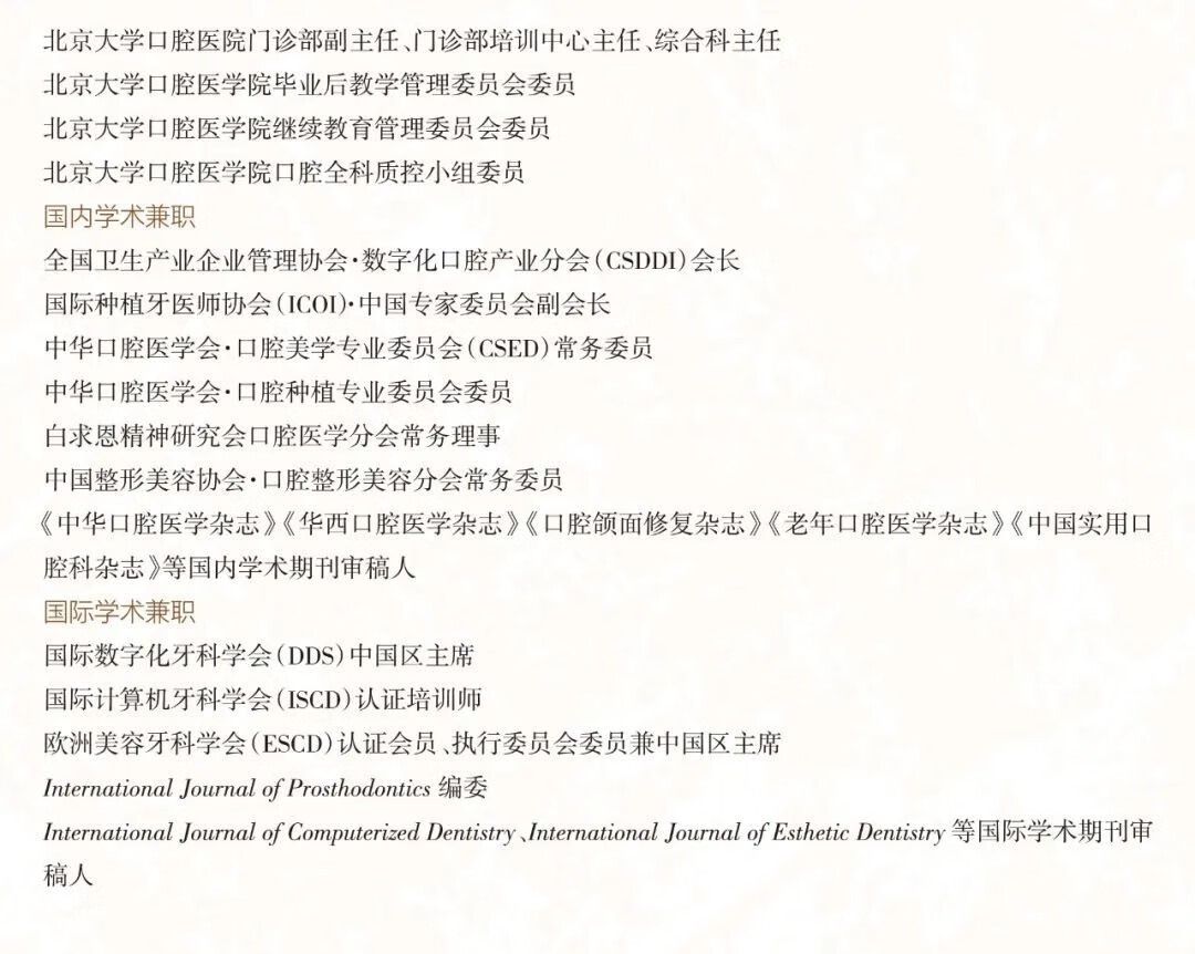 北京大學口腔醫院第一門診部副主任、培訓中心主任、綜合科主任,北京大學口腔醫院教學品質管制委員會委員、繼續教育管理委員會委員,中華口腔醫學會口腔美學專委會常務委員,中華口腔醫學會口腔修復專委會委員,全國衛生產業企業管理協會數位化口腔產業分會主任委員, 中國整形美容協會口腔整形美容分會常務委員,中國整形美容協會專家委員會委員,歐洲美容牙醫學會(ESCD)認證會員兼中國區主席。