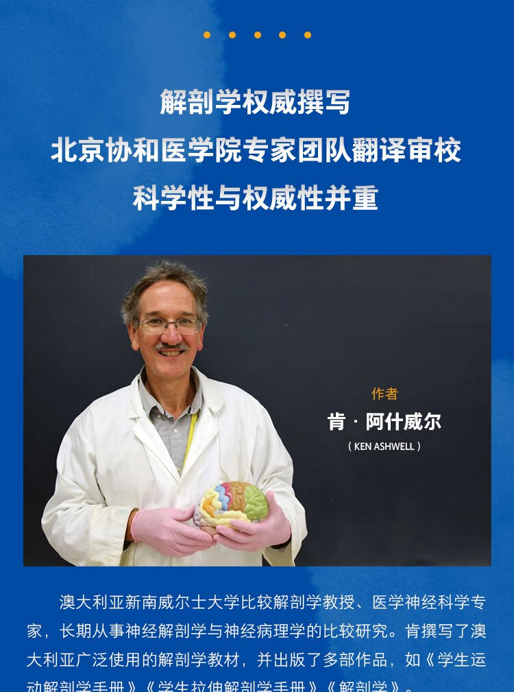 肯·阿什威爾(Ken Ashwell),澳大利亞新南威爾士大學比較解剖學教授,醫學神經科學專家,長期從事神經解剖學與神經病理學的比較研究。 他還撰寫了澳大利亞廣泛使用的解剖學教材。 肯致力於給醫學、保健、運動及理工科專業的學生講授解剖學,已超過30年,並積極參與腦發育和腦進化的研究,出版有多部作品:《學生運動解剖學手册》《學生拉伸解剖學手册》《大腦之書:發展、運行、失序和健康》以及《解剖學》等。