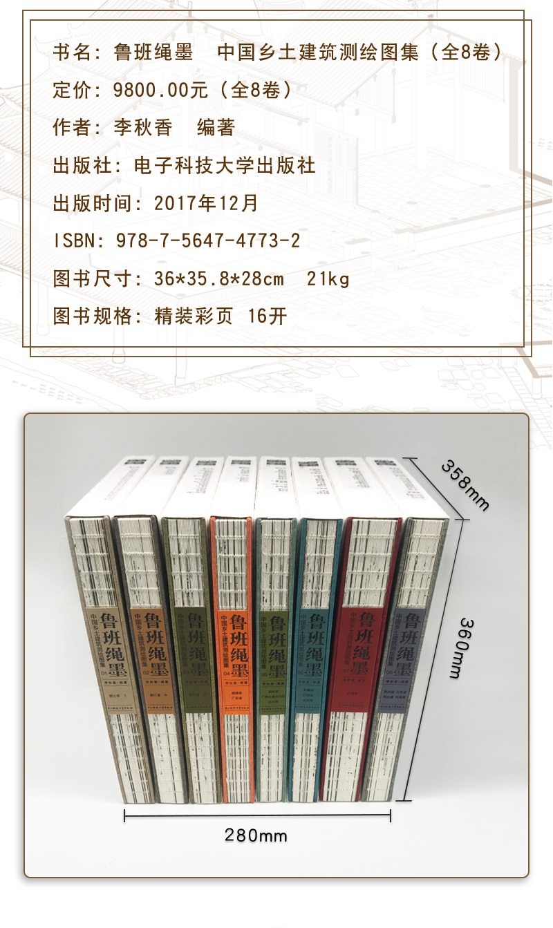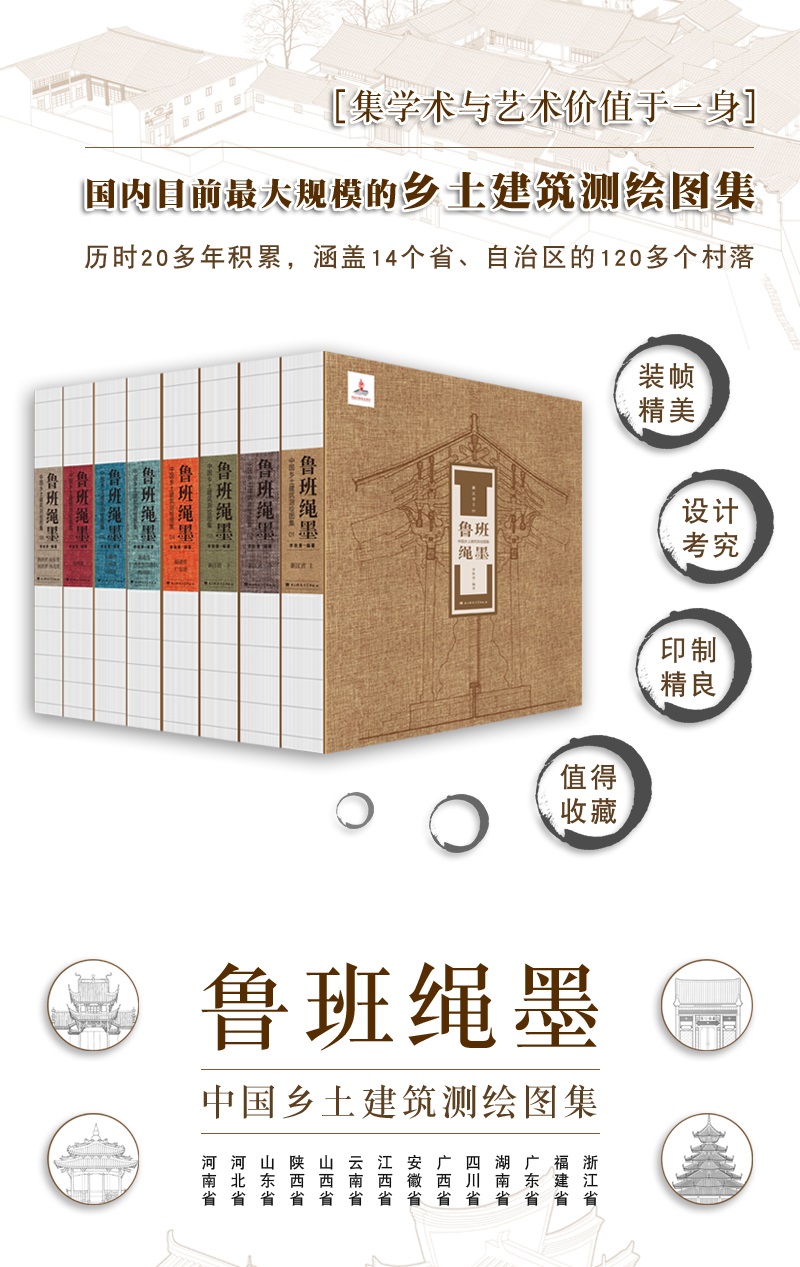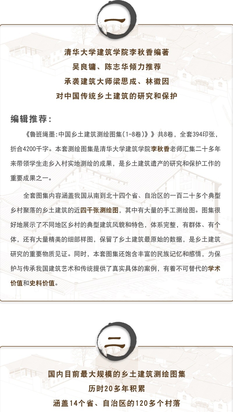 《魯班繩墨:中國鄉土建築測繪圖集(1-8卷)》彙集了清華大學建築學院李秋香老師和她所在“鄉土建築研究組”二十餘年帶領學生走鄉入村實地測繪的成果,該課題組傳承清華建築大師梁思成、林徽因繼承、搶救中國民族建築的傳統, 以科學嚴謹的工匠精神為我國的建築文化留下了不可替代的珍貴史料。 本書獲得兩院院士、中國建築學家吳良鏞先生的高度評價和大力推薦。