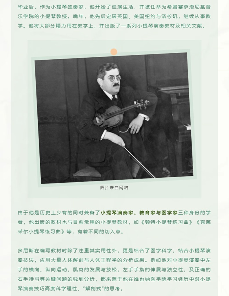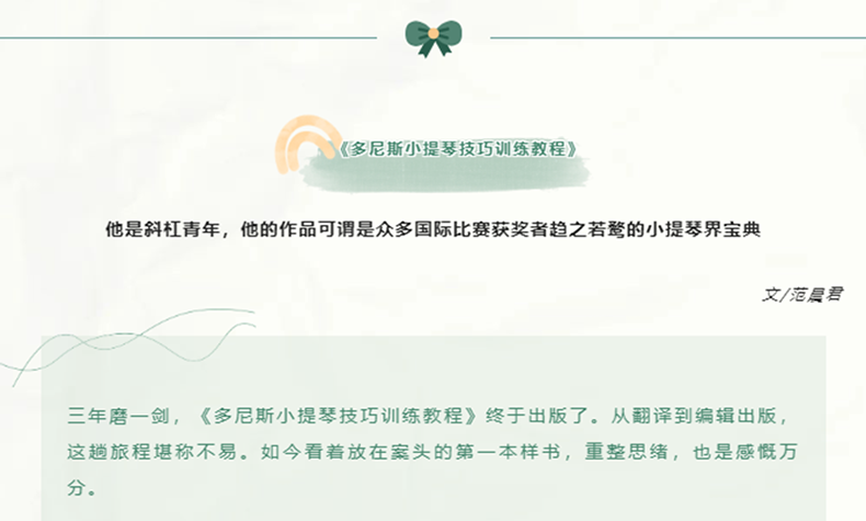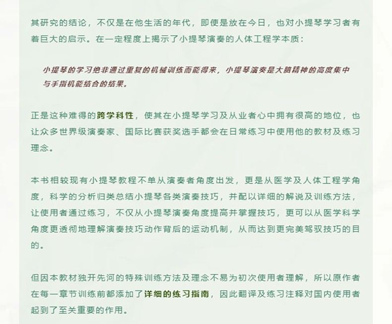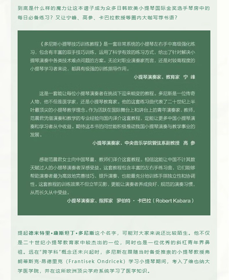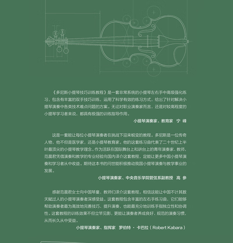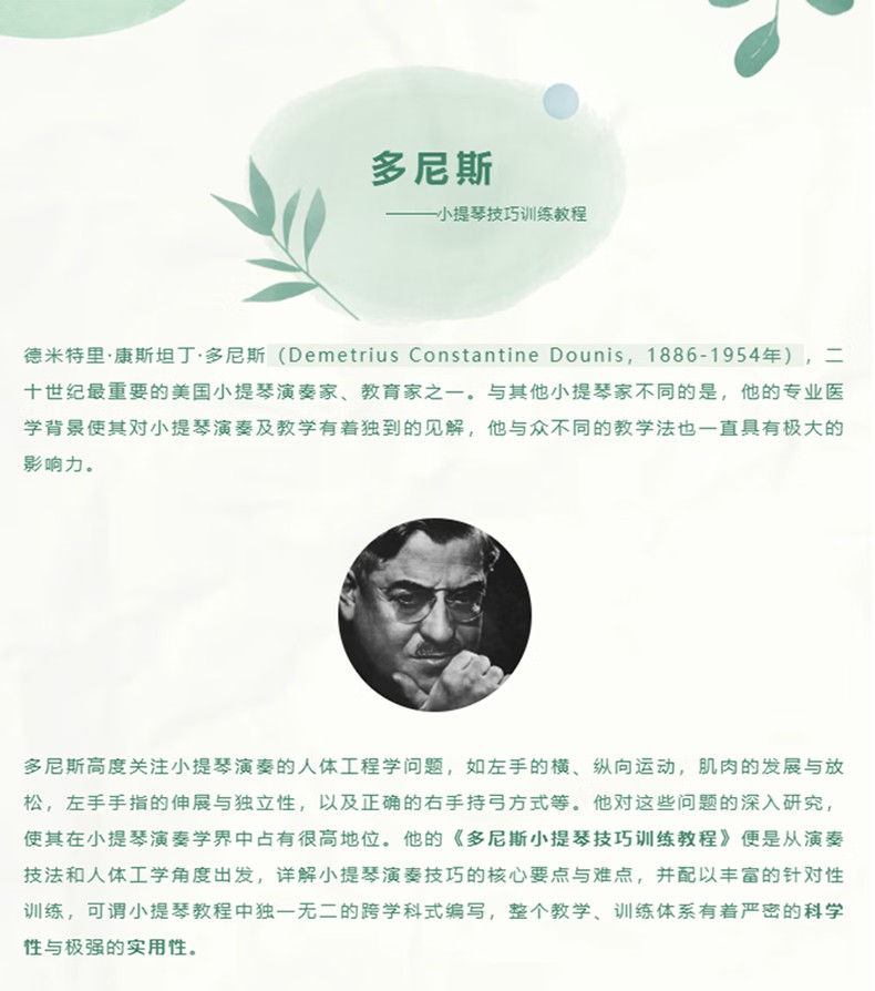 由二十世紀最重要的美國小提琴演奏家、教育家之一德米特裏·康斯坦丁·多尼斯著。 與其他小提琴家不同的是,他的專業醫學背景使其對小提琴演奏及教學有著獨到的見解,他與眾不同的教學法也一直具有極大的影響力。 教程從演奏技法和人體工學角度出發,詳解小提琴演奏技巧的覈心要點與難點,並配以豐富的針對性訓練,可謂小提琴教程中獨一無二的跨學科式編寫,整個教學、訓練體系有著嚴密的科學性與極强的實用性。