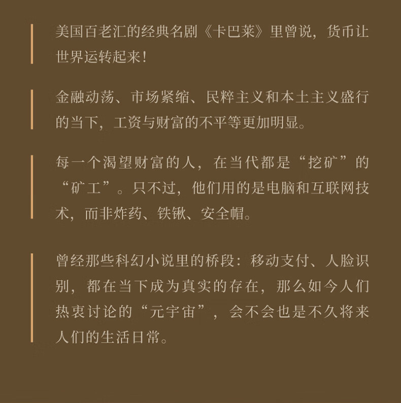 隨著全球金融危機和經濟下行,現代社會被視為貨幣轉型時期。 國家貨幣與經濟政策成為這一時期的見證者,多樣化的科技支付手段開始出現,新的金融工具誕生。 貨幣一次又一次被揭示為文化與實踐的想像與公眾和政治的鬥爭。 現代貨幣——作為流通形式和財富的象徵,仍然保持者不確定性,吸引了個人和福斯的視線,但社會基礎價值和財富分配結果的衝突時刻都在上演。 本書展示了現代科技理念、禮制、宗教文化的發展,以及貨幣在這些方面帶來的影響與其相互作用。