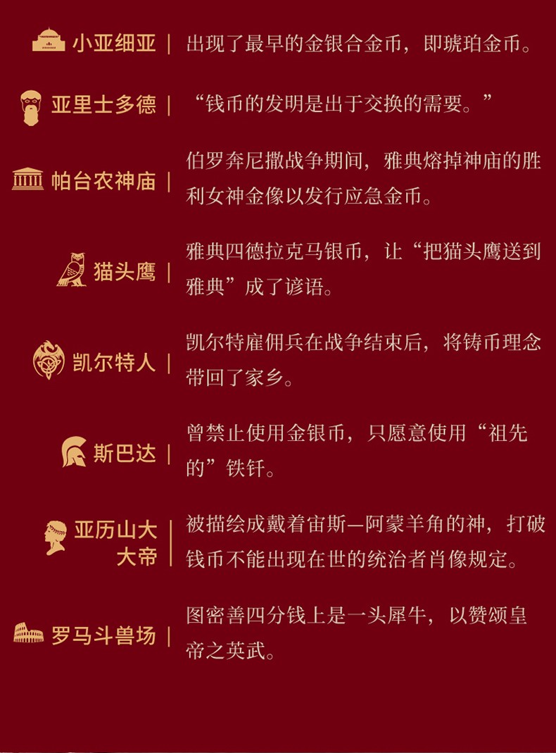 錢幣是希臘文化與羅馬帝國權力的象徵,它使不同的價值和文化體系趨同。 沒有錢幣的誕生,就沒有希臘城邦的繁榮與羅馬帝國的形成。