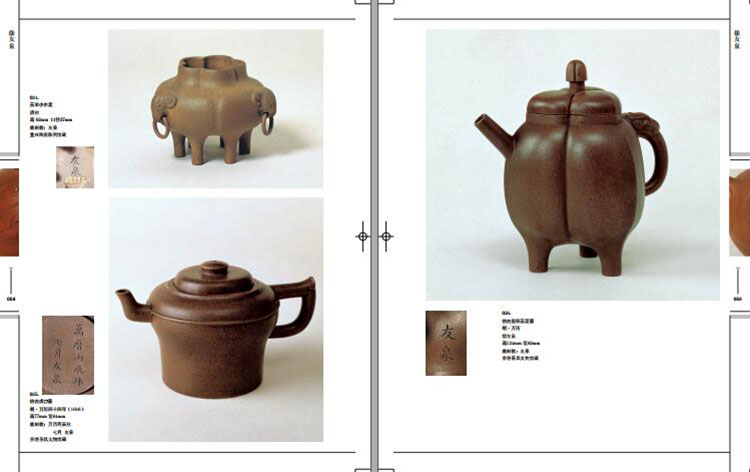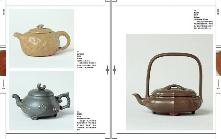 圖版部分介紹宜興紫砂精品五百一十一件(套),分歷史、現代兩大部分,按製作年代先後排列。歷史部分以一九四九年為界限,展示了明、清、民國五十八位名家的一百六十七件精品;現代部分以高級工藝師的作品為主,展示了九十一位名家的三百四十件(套)精品。