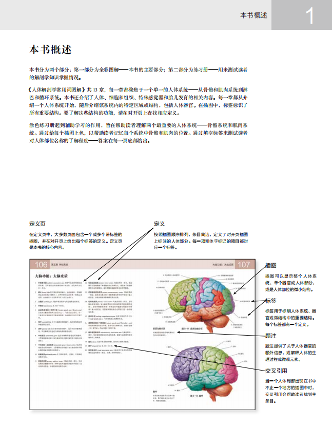 第一部分:每一章都聚焦於一個單一的人體系統——從骨骼、肌肉系統到淋巴和循環系統。 此外,還概述了人體、細胞和組織、特殊感覺器和胎兒發育的相關內容。 每一章都從介紹一個人體系統開始,其後介紹該系統內的特定區域或結構,包括人體器官。 在插圖中,用標籤標識了所有重要結構。 每個單挑頁,一頁為術語解釋,一頁為圖片,可對照著查找相應的定義。