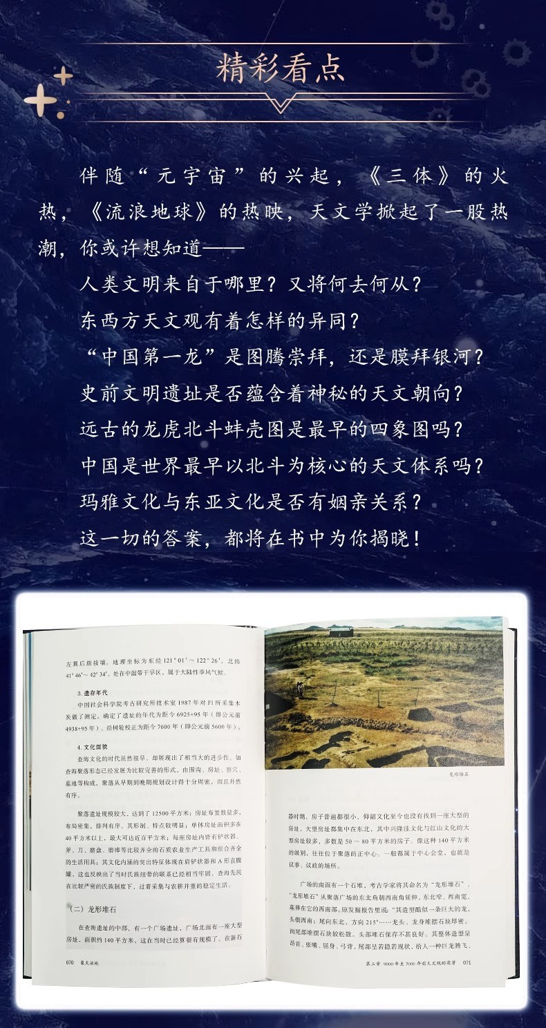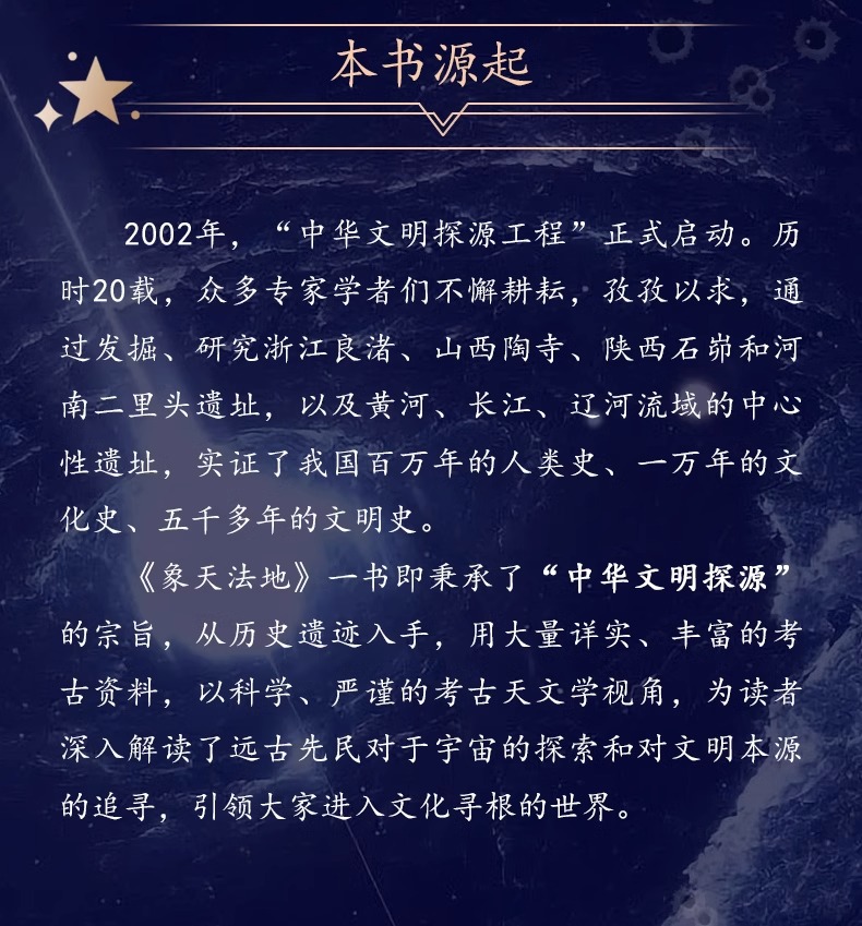 《象天法地》一書即秉承了“中華文明探源”的宗旨,從中國遠古眾多歷史遺跡入手,用大量詳實、豐富的考古資料,以科學、嚴謹的考古天文學視角,為讀者深入解讀了遠古先民對於宇宙的探索和對文明本源的追尋,引領大家進入文化尋根的世界。