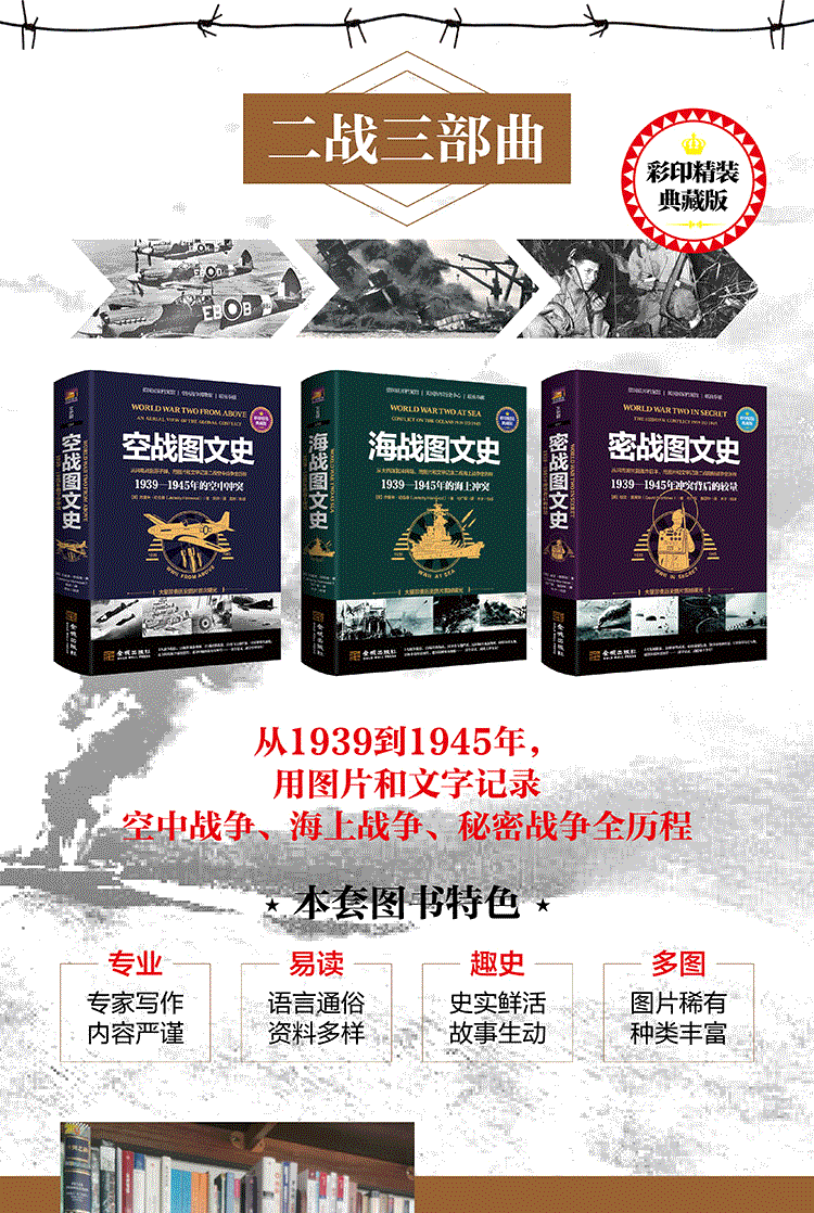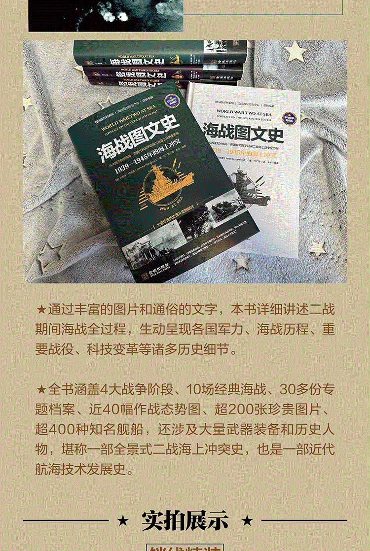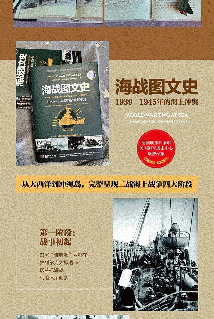 全書涵蓋4大戰爭階段、10場經典海戰、30多份專題檔案、近40幅作戰態勢圖、超200張珍貴圖片、超400種知名艦船,還涉及大量武器裝備和歷史人物,堪稱一部全景式二戰海上衝突史,也是一部近代航海技術發展史。