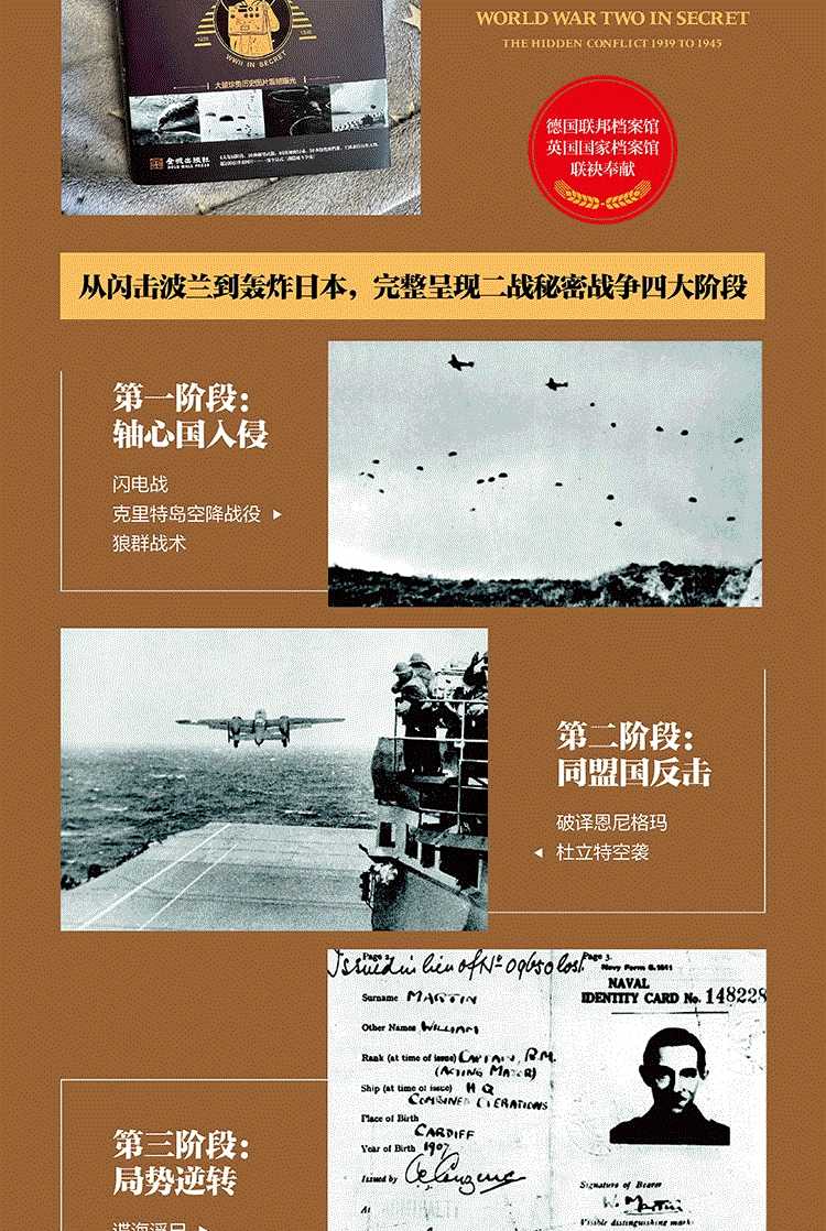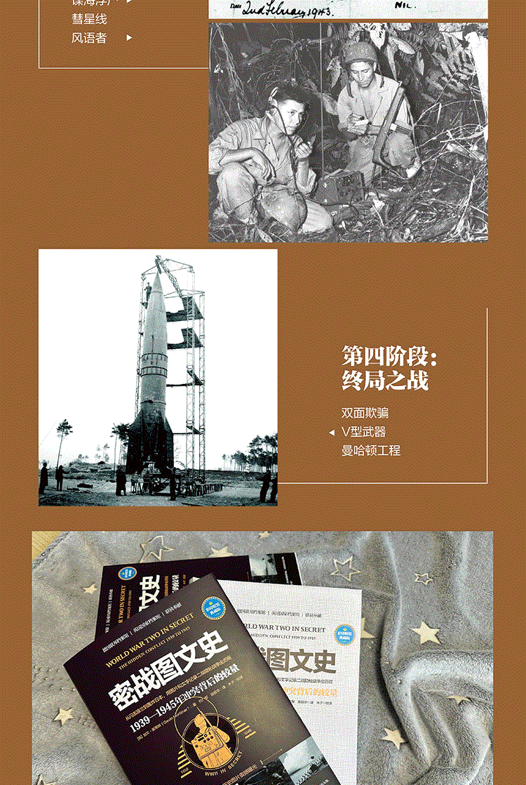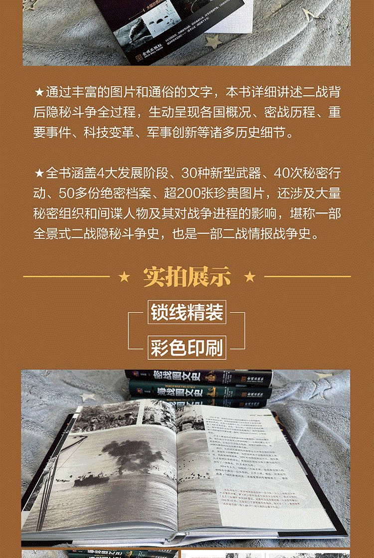 全書涵蓋4大發展階段、30種新型武器、40次秘密行動、50多份絕密檔案、超200張珍貴圖片,還涉及大量秘密組織和間諜人物及其對戰爭行程的影響,堪稱一部全景式二戰隱秘鬥爭史,也是一部二戰情報戰爭史。